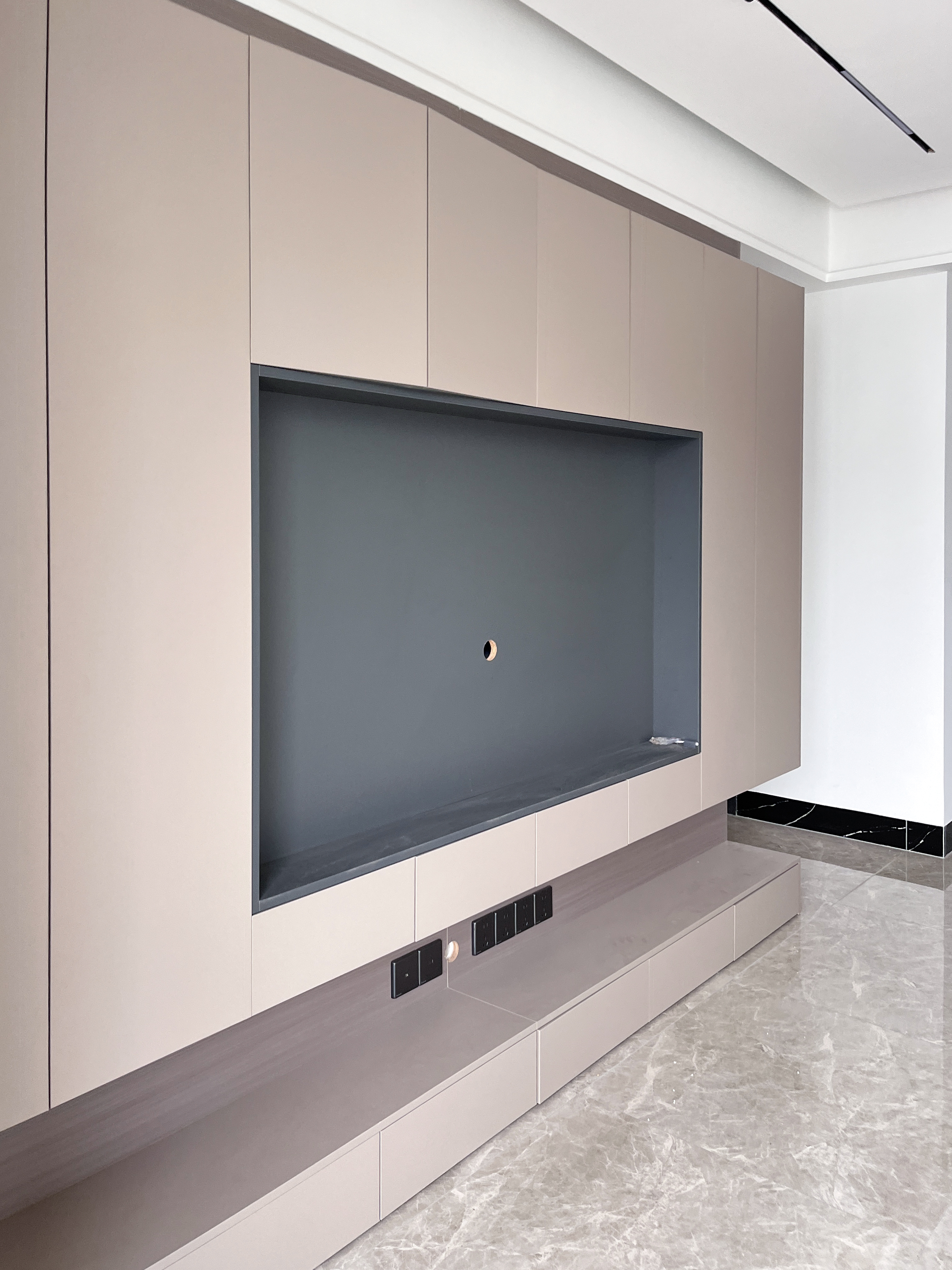 原木色柜子被打造成了鏤空的樣式,這個小巧思讓柜子變得獨特又實用。中間嵌入電視機,再忙碌也別忘了坐下來放松放松、給自己的身心放個假,下層的鏤空可以充電和放置其他生活雜物,主打的就是一個便利~