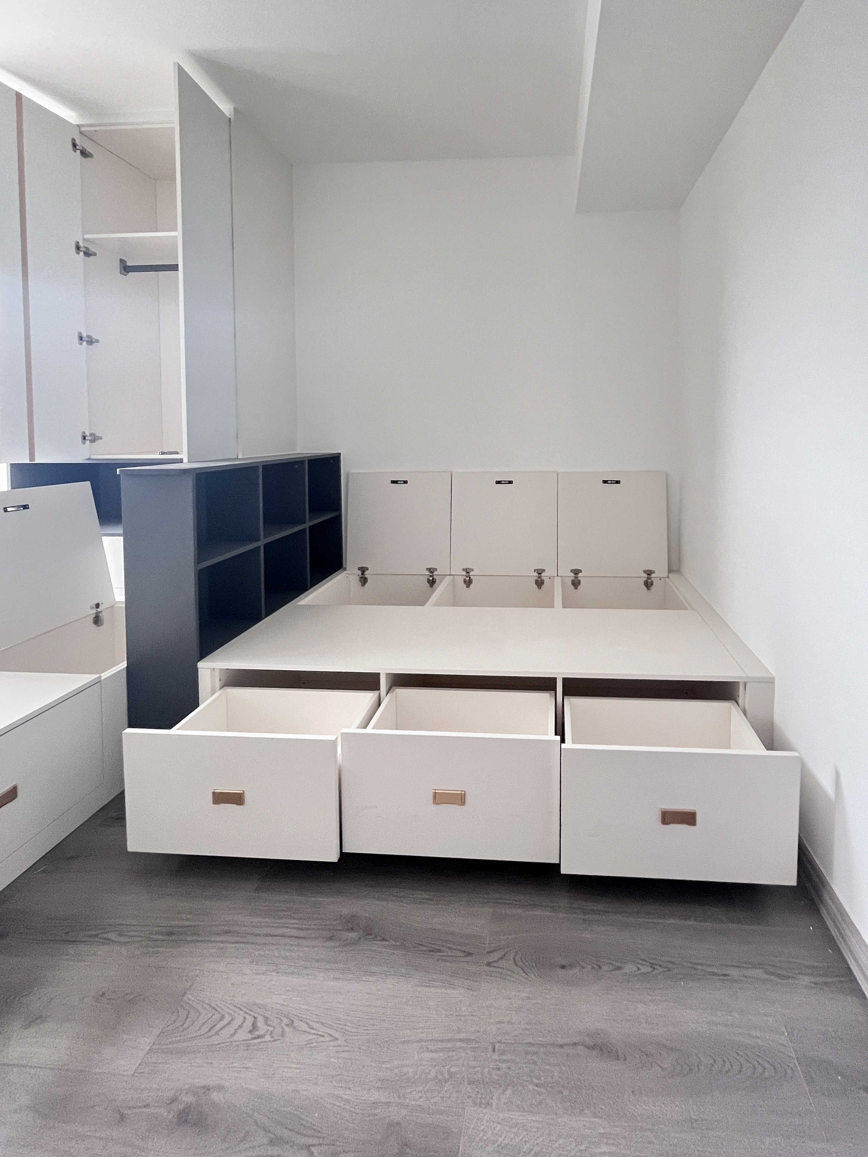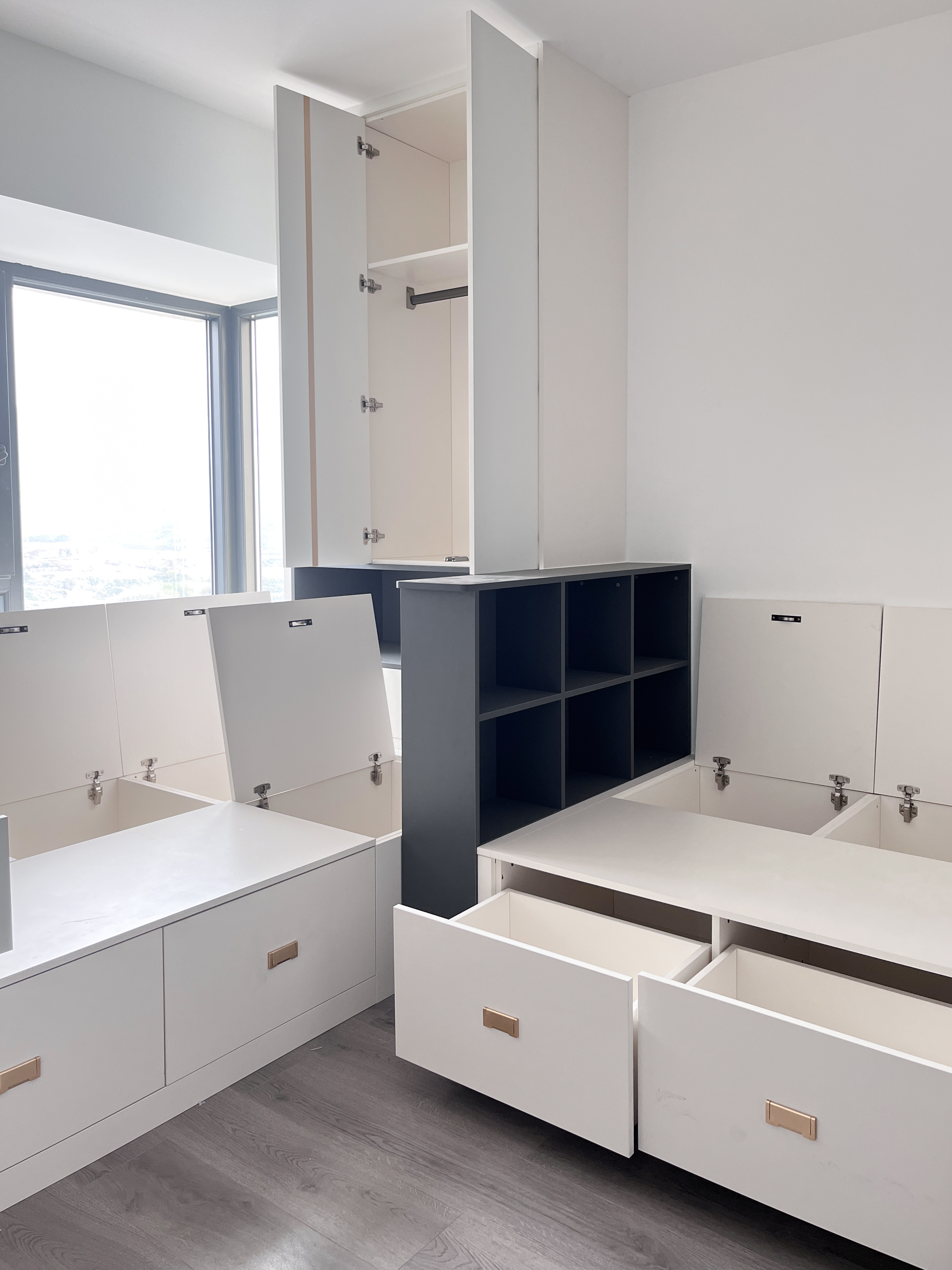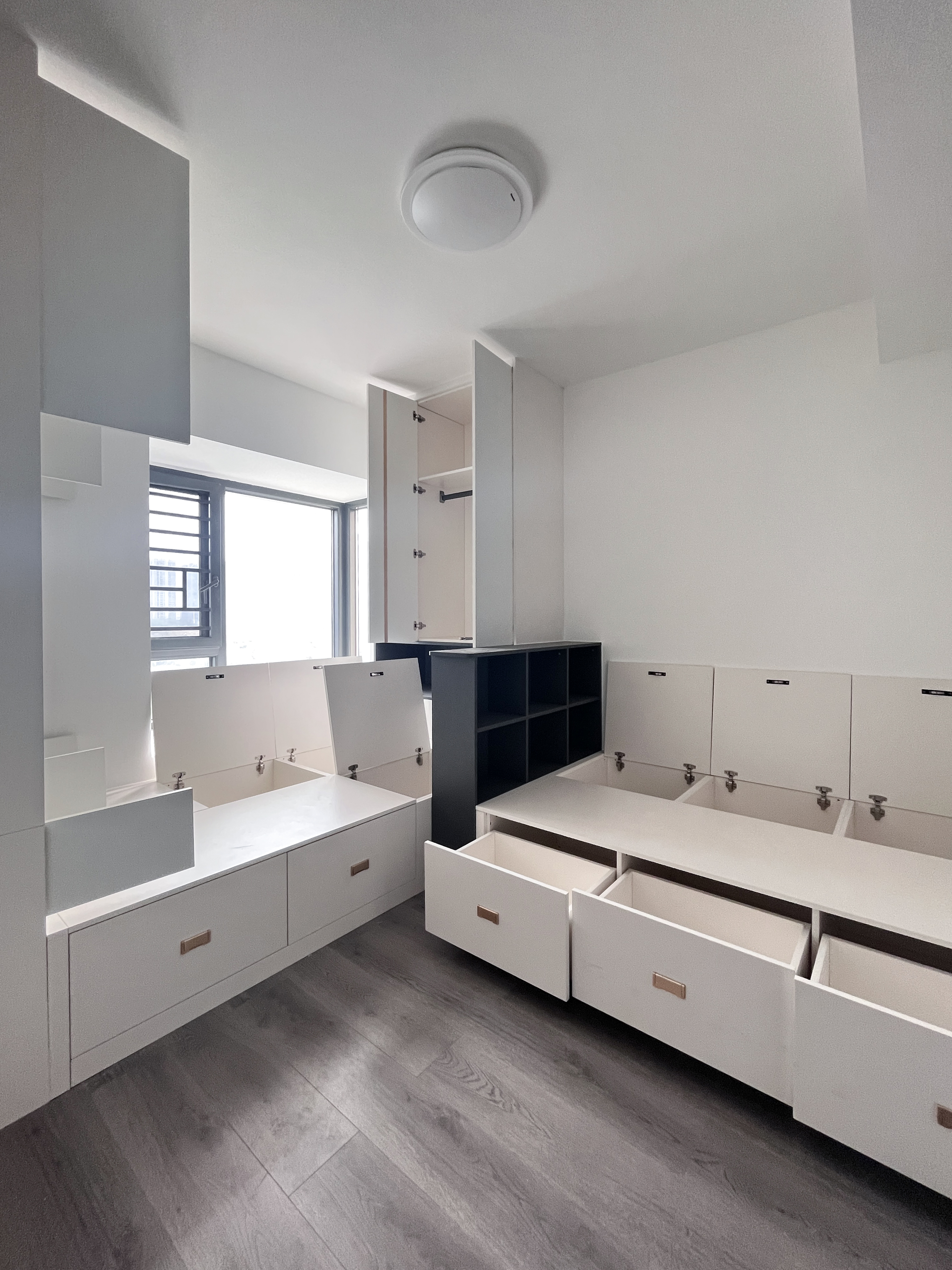 如何在有限的空間內將屋子創造出更大的價值成了一大難題,設計師想到將次臥做成榻榻米設計,功能與顏值并存著,既美觀又實用!白色的柜子打開便可以收納日常不怎么需要用到的物品,增加了儲物空間,關上就成了供人休息的床、飲茶的茶室、看書的書房等等,一不小心就成了多功能房,誰能不愛!