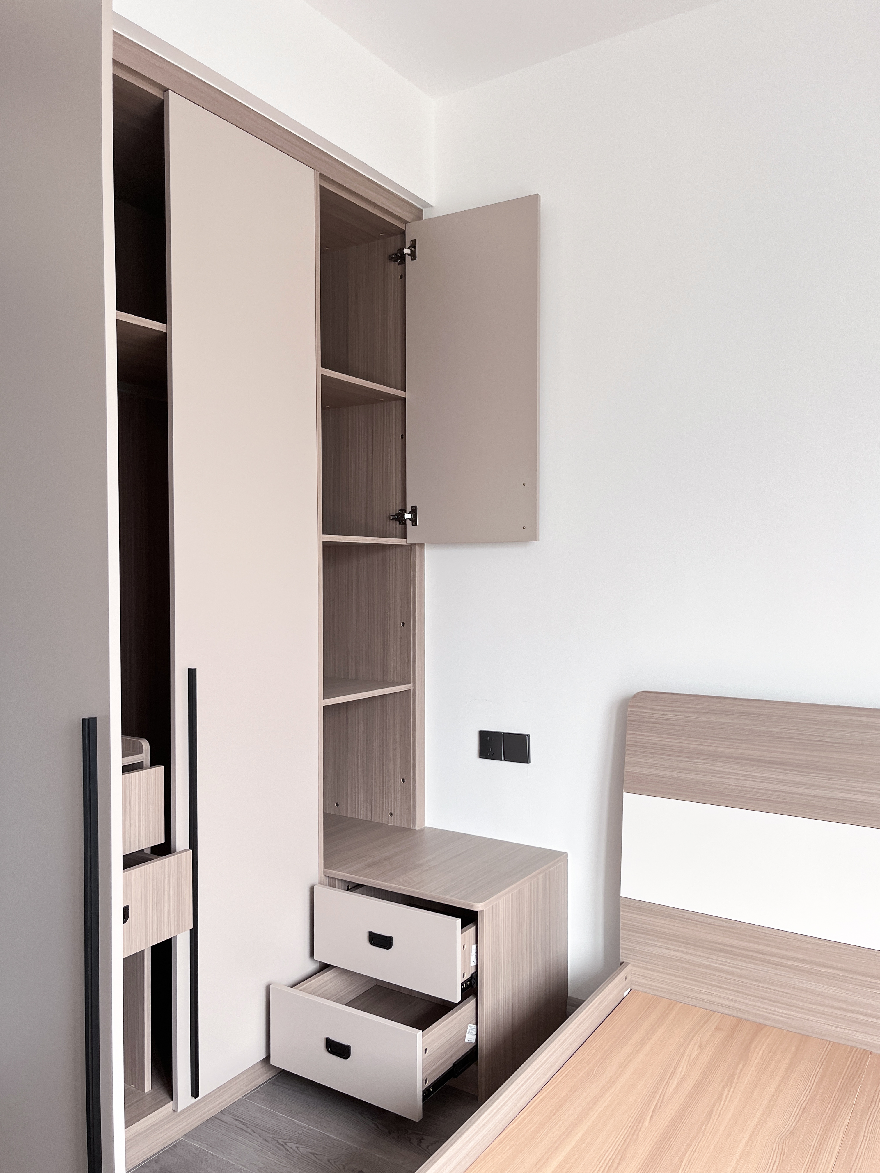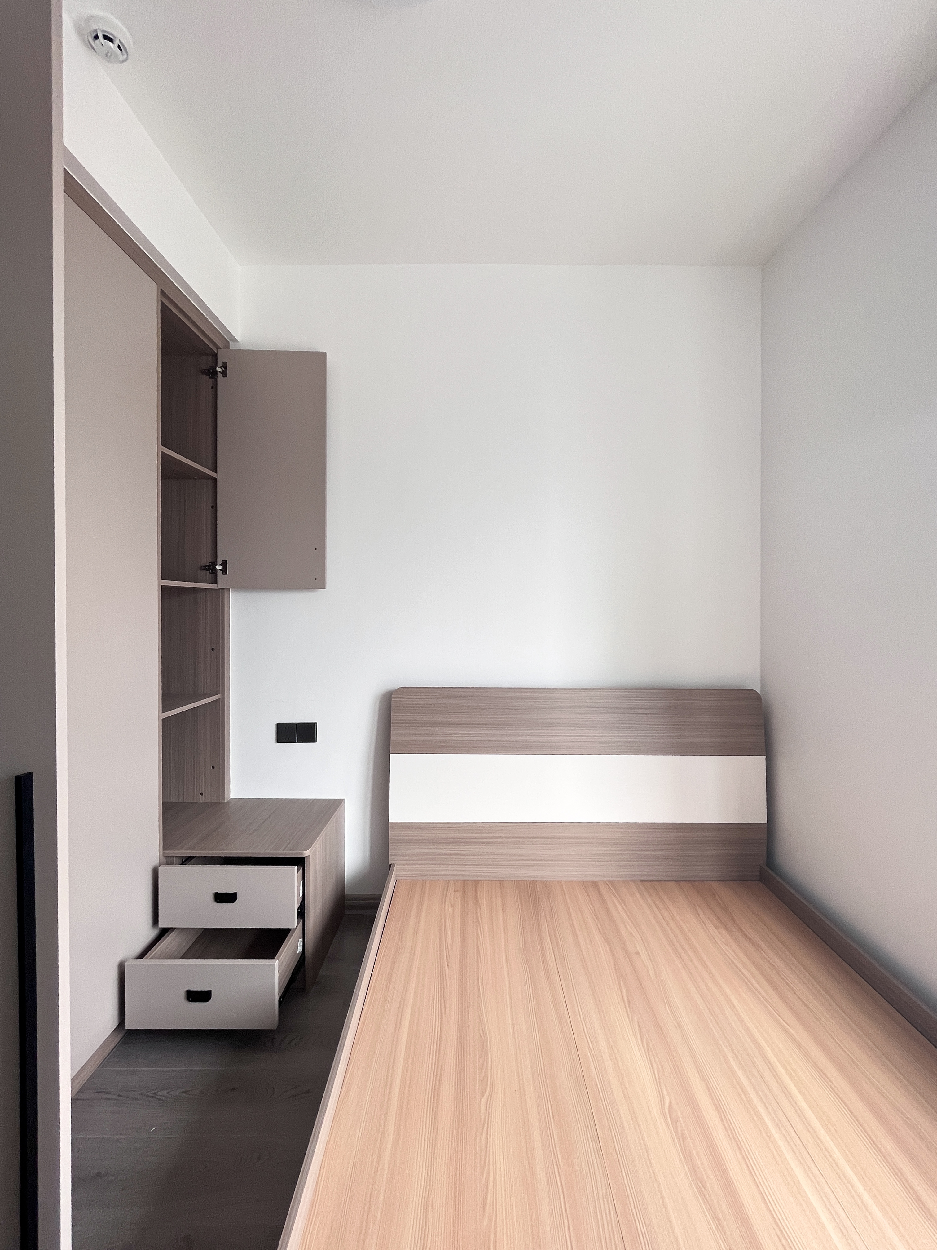 對于所有人來說,雜物收納永遠是大難題,所以設計師不僅將衣柜打造成了收納物品的工具,還在衣柜與床放置了一個小的收納柜子,讓雜物有了“家”一切都變得觸手可及起來。