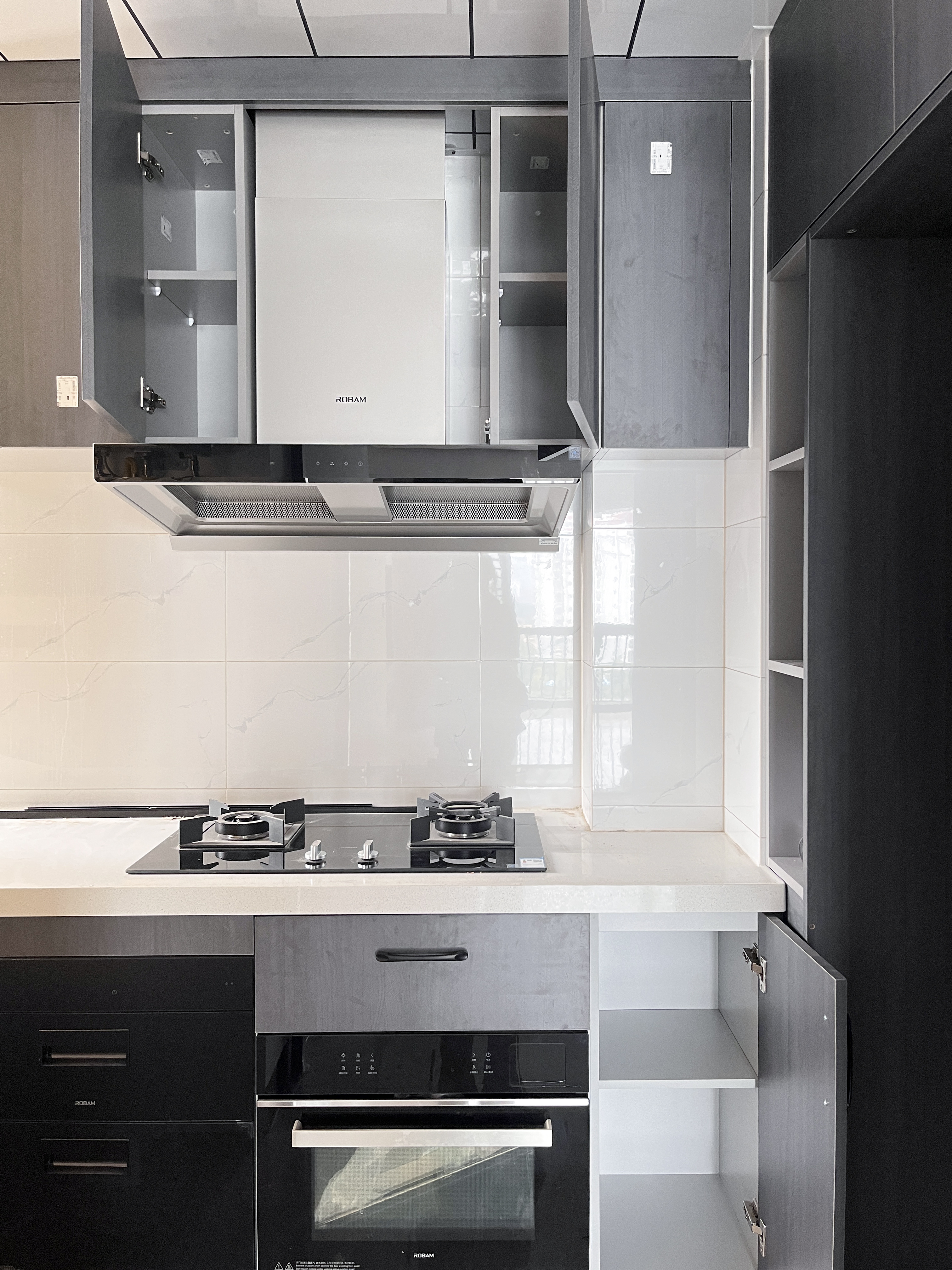 廚房由一扇推拉式的玻璃門隔開,映入眼簾的是黑白灰色調的灶臺,簡約又高級,灶臺上方設置的大收納柜、下方打通的空格讓業主一伸手就能拿到下廚需要用的佐料,主打一個方便!