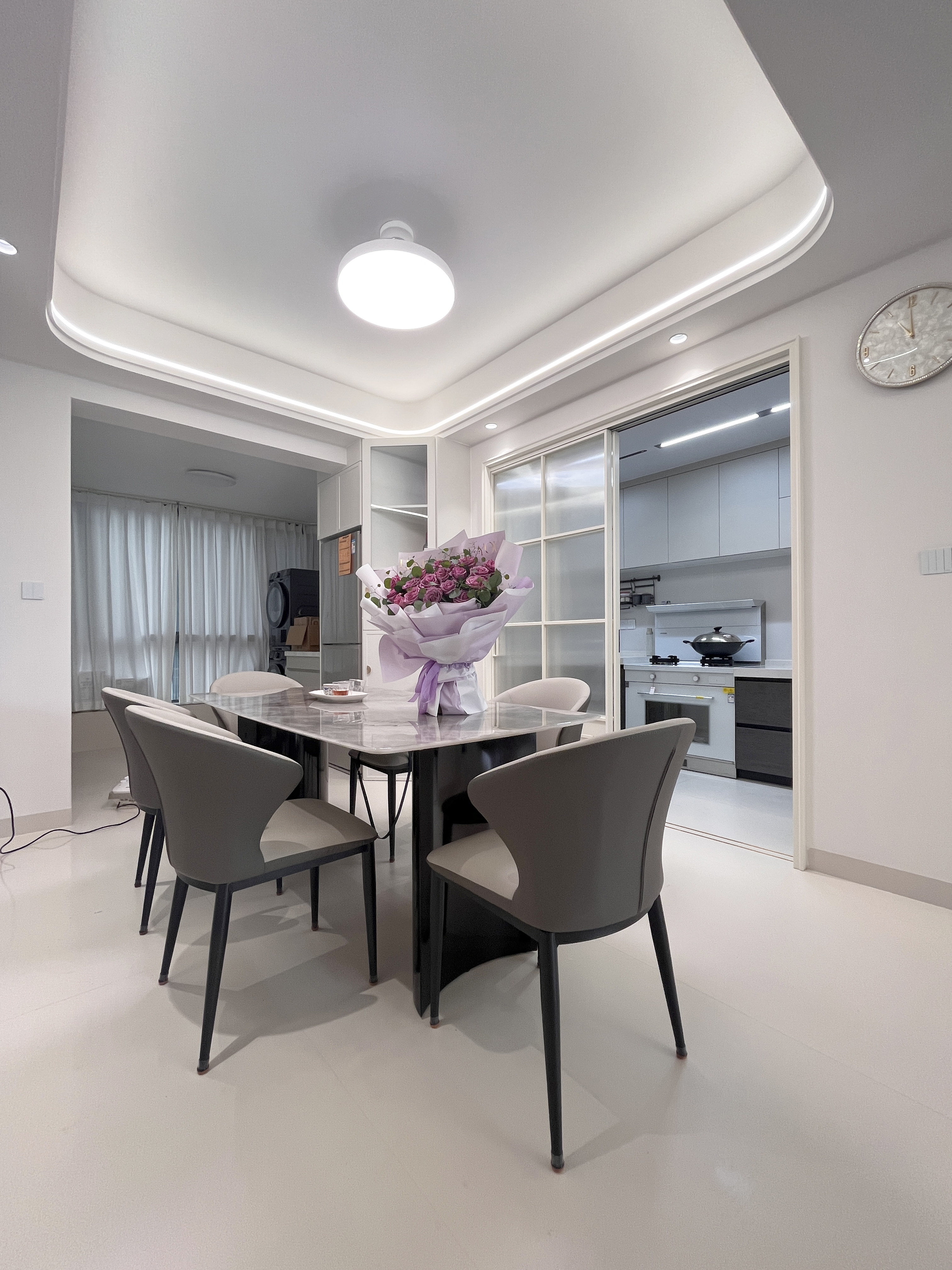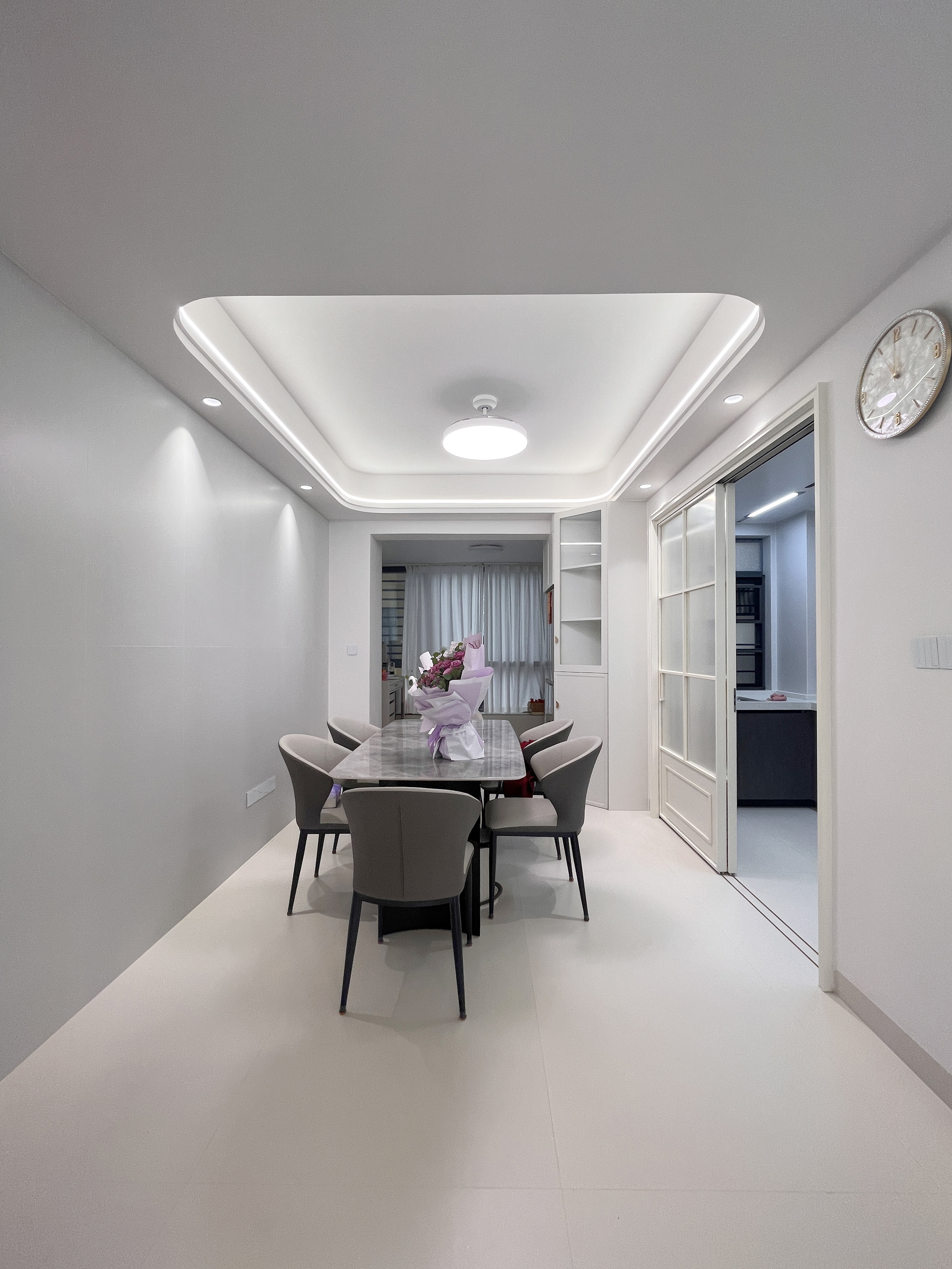 餐廳位置頂上做了專屬空間的吊頂,和客廳形成邊界,在原來的基礎上增加了立體空間感,選擇一個長桌做軟裝的布置,很大程度增加了家里人走動的公共空間,主燈燈光落下,能很好的營造空間的氛圍感。