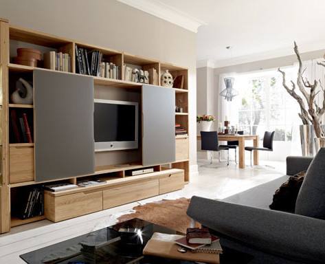 收納型的電視背景墻十分適用于小戶型,戶型越小,儲物面積就顯得越發珍貴。大多數設計師在設計小戶型的時候,都會想法設法地增加儲物面積,電視背景墻這么一大塊地方,自然不能浪費。