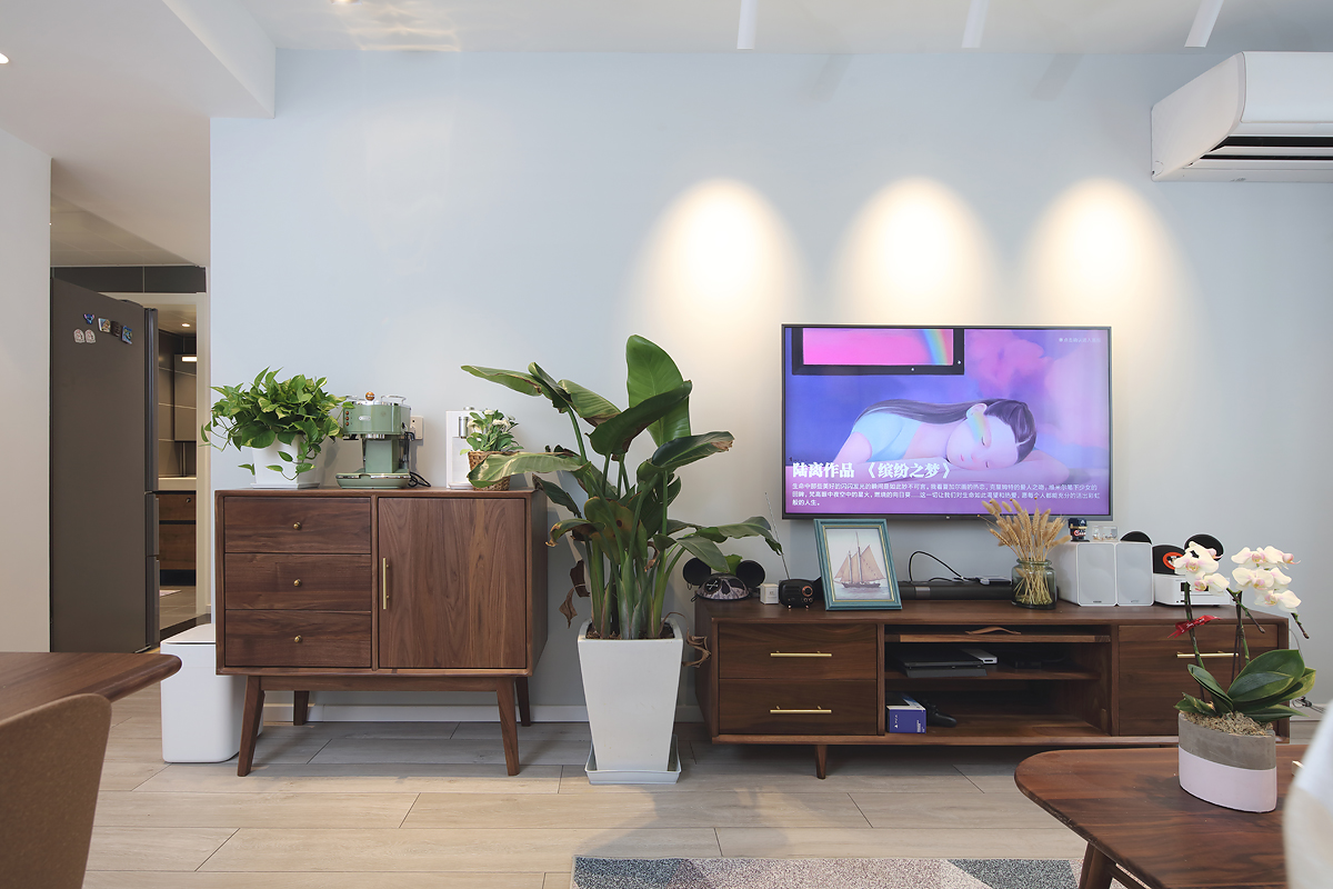 木質的櫥柜和電視柜,本來沒有什么特別之處,但是金屬質地的把手和圓錐腳的設計,就彰顯出了復古的優雅氣質。