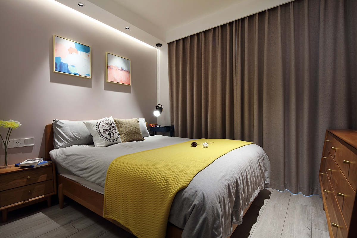 床頭的背景墻跟駝色相近,藏光的設計很是獨特。臥室的光源不需要很多,只要夠用就好。