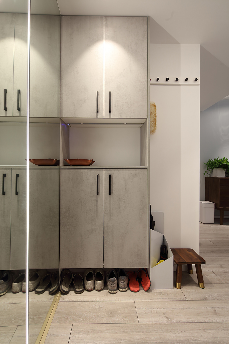 玄關處的鞋柜是定制的,中間的留空部分是為了隨手放置鑰匙之類的小物件,懸空部分可以放置一些常穿的鞋子,很是方便。