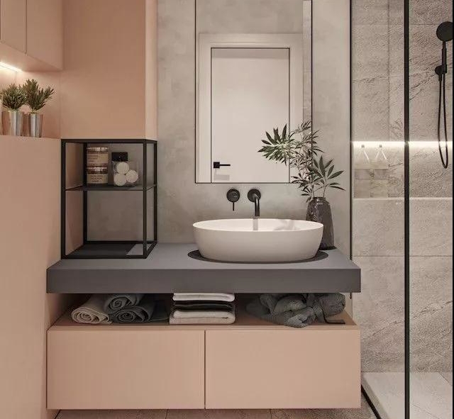 浴室柜是不可或缺的,但是又占據著大量的面積,不妨試試掛墻式或是嵌入式浴室柜,將柜體嵌入墻內,充分利用墻面空間,使浴室看起來更整潔寬敞,同時要選用防潮性能較好的浴室柜,否則很容易受潮變形和發霉。