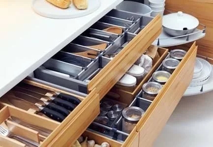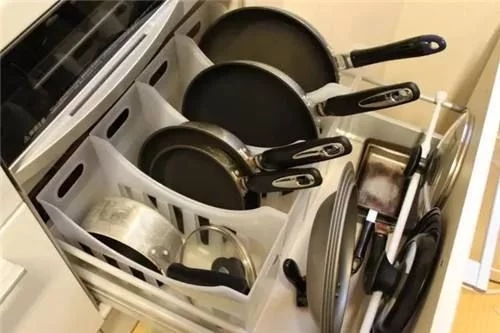 這里建議采用抽屜式的收納地柜,設計時考慮放置物品的的大小設置抽屜的高度和深度,一般從上至下進行遞增,將物品豎起來,再用收納架隔離不同的鍋碗,拉開抽屜,所有的物品一目了然。