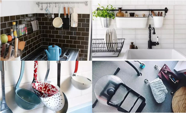 很多時候我們覺得廚房擁擠是因為,供我們施展廚藝的臺面被鍋蓋、鍋鏟、湯勺、菜刀、漏勺、小奶鍋等廚具占據了,這些雜物剛好是我們使用頻率較高的物品,如果收起來用的時候拿取就不方便,最好的辦法是讓它們上墻。