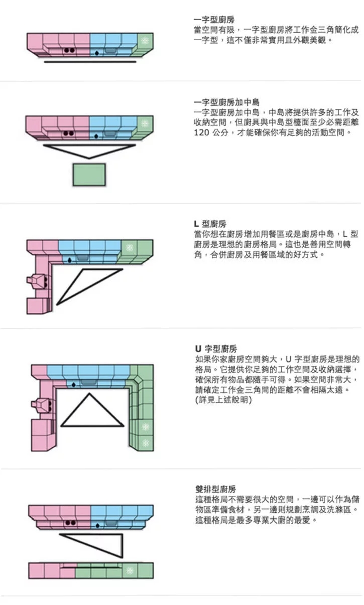 如果家里的廚房沒有足夠的空間呈現這個工作金三角,可以在裝修時通過合理的規劃讓這三點達到金三角的效果,讓廚房的工作更流暢更有效率。