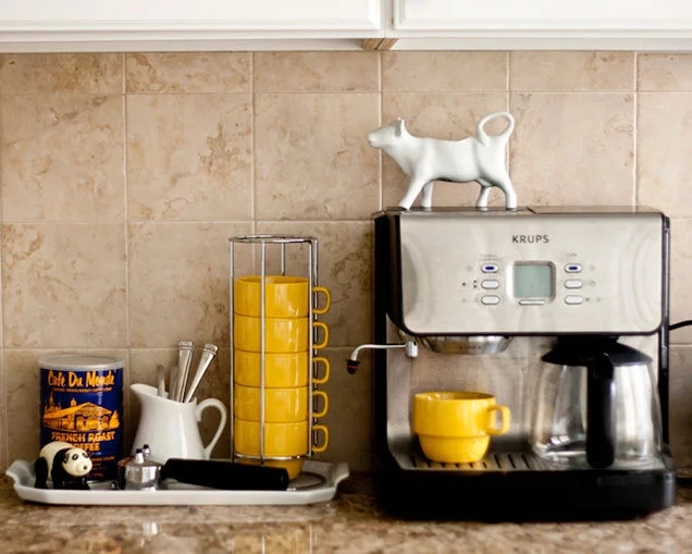 相互聯系的物品也要就近收納在一起,例如水壺和咖啡機放在展示區的臺面上,一抬手或者一彎腰就可以拿到咖啡杯和勺子;飯勺和筷子碗放在一起,這樣子拿餐具的同時就會一起拿飯勺去盛飯。