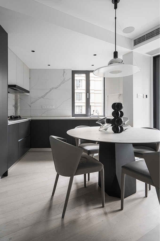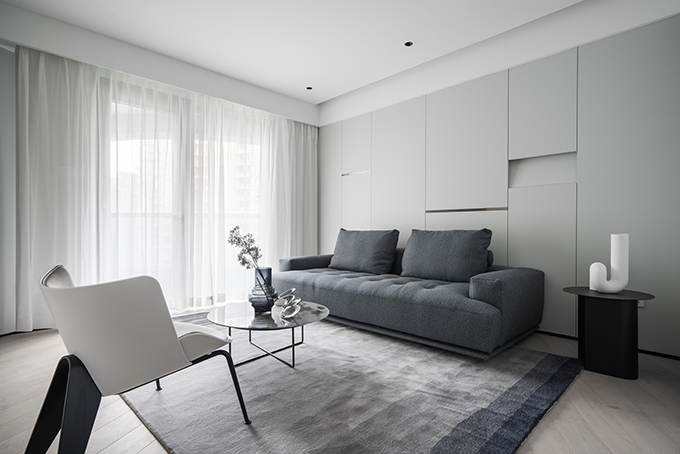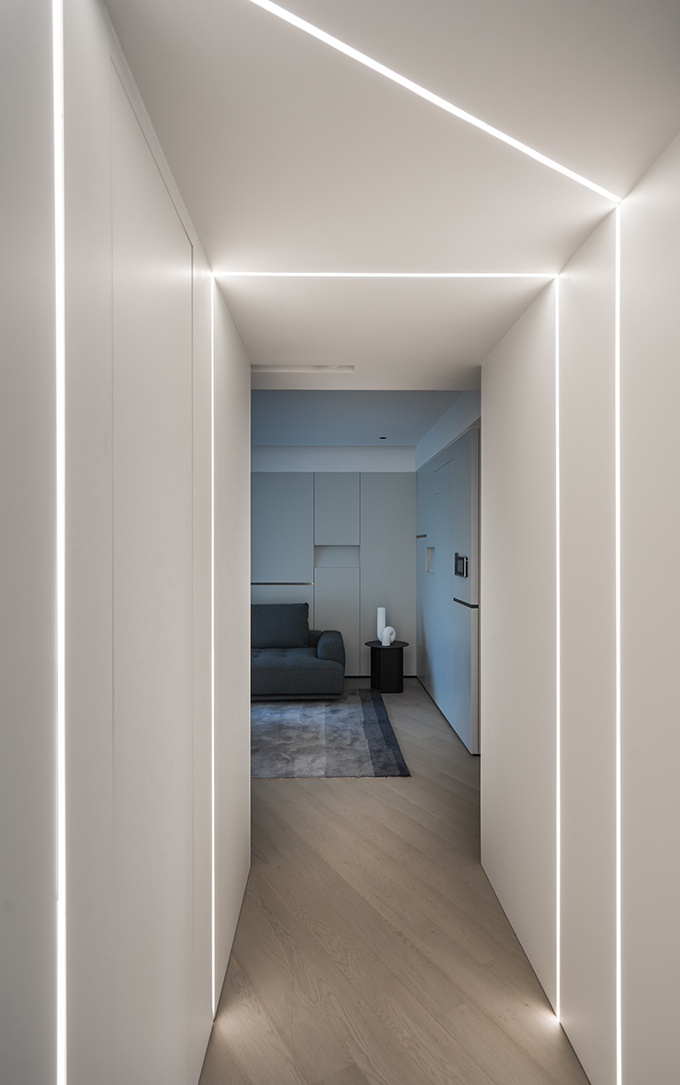 細節(jié)上,大面積的留白,搭配高級灰軟裝,豐富的材質(zhì)和極簡的造型,賦予空間高級質(zhì)感;極具未來感的線性燈光則為極簡家披上華服,其間的精致與溫馨,創(chuàng)造出無限愉悅與驚喜。