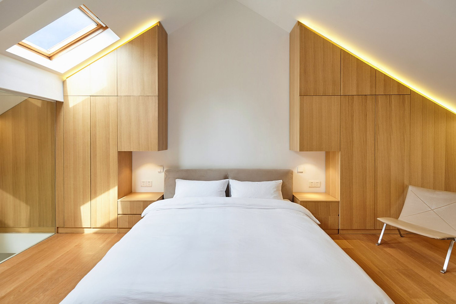 這一套簡(jiǎn)單的小復(fù)式,用了簡(jiǎn)單的方式去裝修。不管是上層的主臥還是下層的空間,都是白墻配上原木,這讓整個(gè)空間看起來(lái)十分開(kāi)闊明亮。