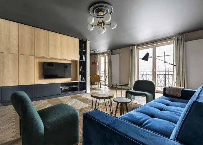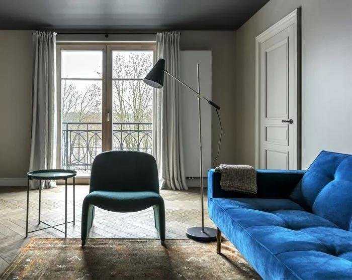 寶藍色的沙發有一種高貴的古典感,作為客廳里最亮眼的存在,它以一己之力提升了整個空間的色彩亮度。