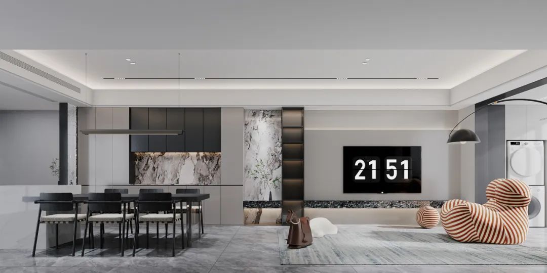 開放式餐廳,由白色吧臺黑色餐桌構成,用餐之余,可與朋友在吧臺上飲茶做樂,餐廳旁柜子臺面為大理石紋理增添了一抹奢華感,整體空間雖不繁復,但每個細節都經過精心布置,展現出高品質的設計感。