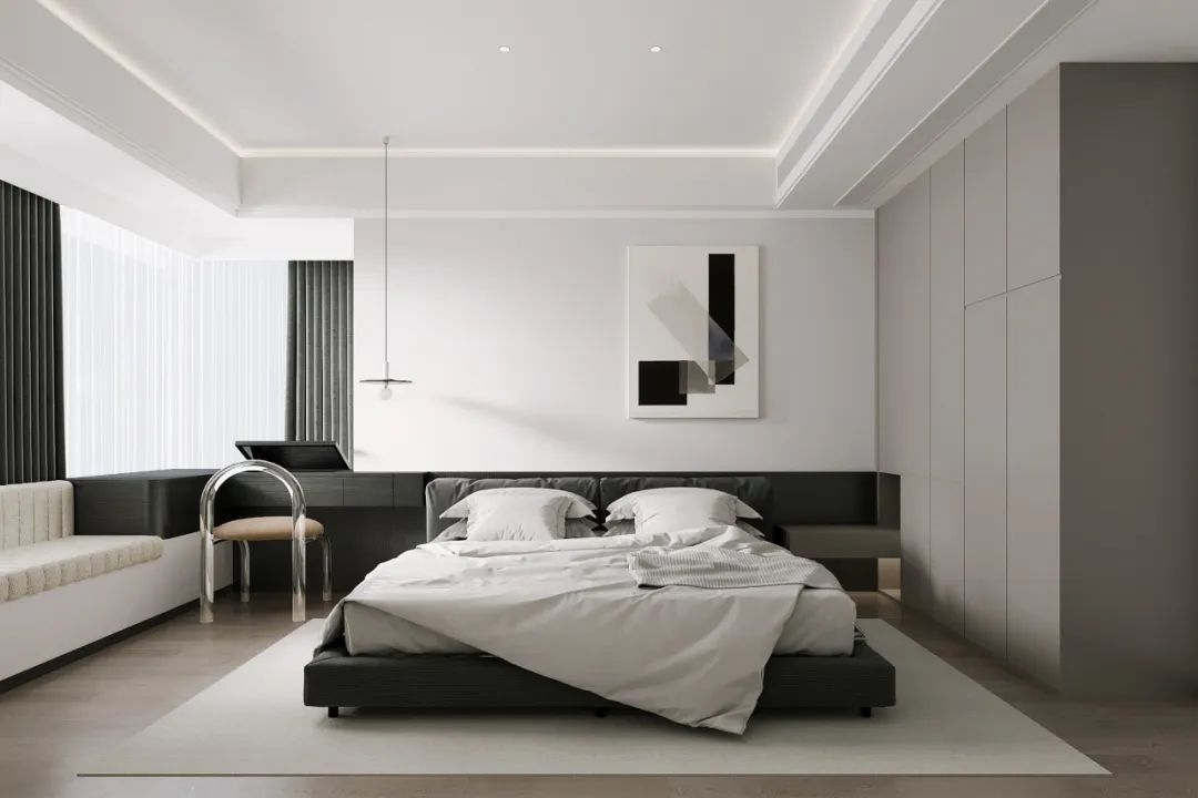 臥室以白色和灰色為主調,營造簡潔寧靜氛圍,大床居中,兩側分別配置沙發和椅子,形成休息與休閑區域,現代吊燈增添溫馨感,大面積地毯提升舒適度,閱讀角設于窗邊,充分利用自然光。