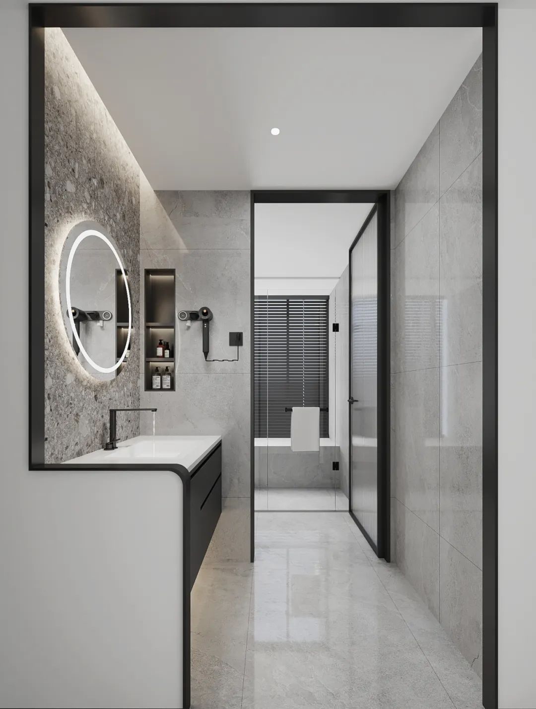 干濕分離,功能區域分明,灰白為主,大理石紋理設計增添高端質感,左側梳妝臺配備圓形鏡子和白色洗漱盆,下方為黑色抽屜柜,實用且美觀。