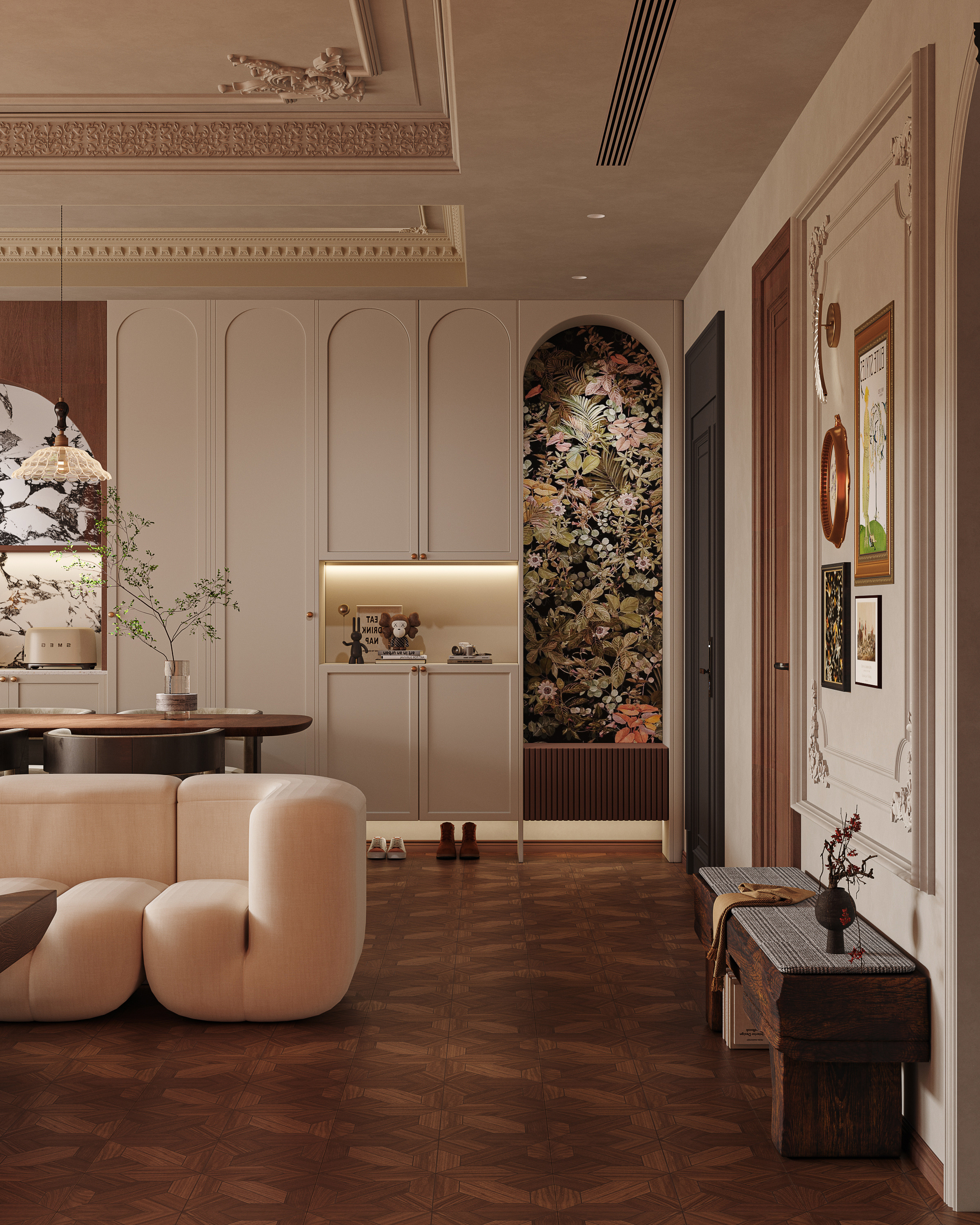 沙發背后的壁柜,精心繪制了繁復而精致的花卉圖案,每一朵花都經過細膩的筆觸勾勒,栩栩如生,為整個房間增添了一抹自然與生機的氣息。除了外表的美觀,壁柜還具有強大的收納功能,內部空間寬敞,可以容納大量的物品,令家中整齊有序。沙發做成彎曲形狀,線條流暢而優雅,色彩與整體空間相協調,既保持了法式的古典韻味,又不失現代感