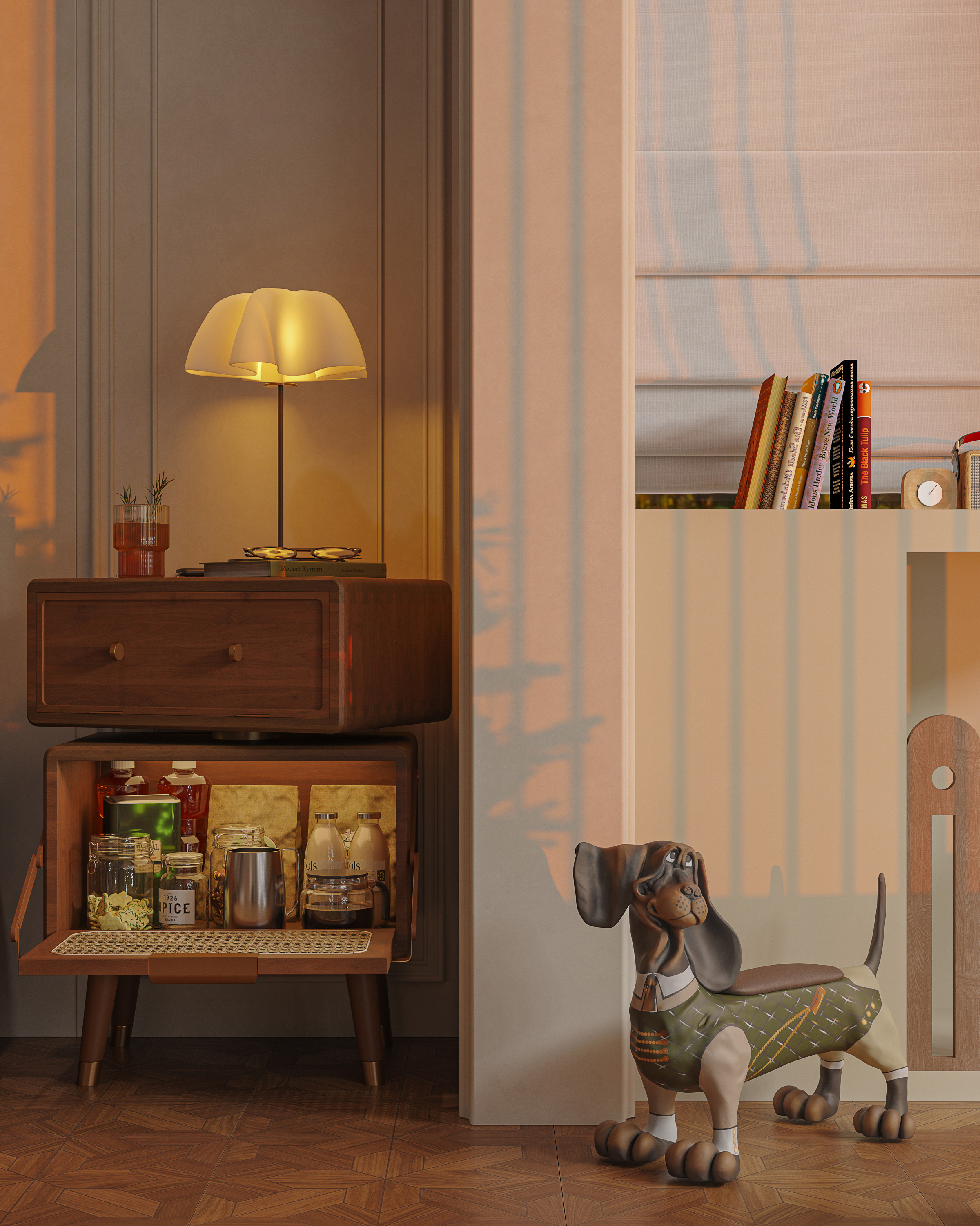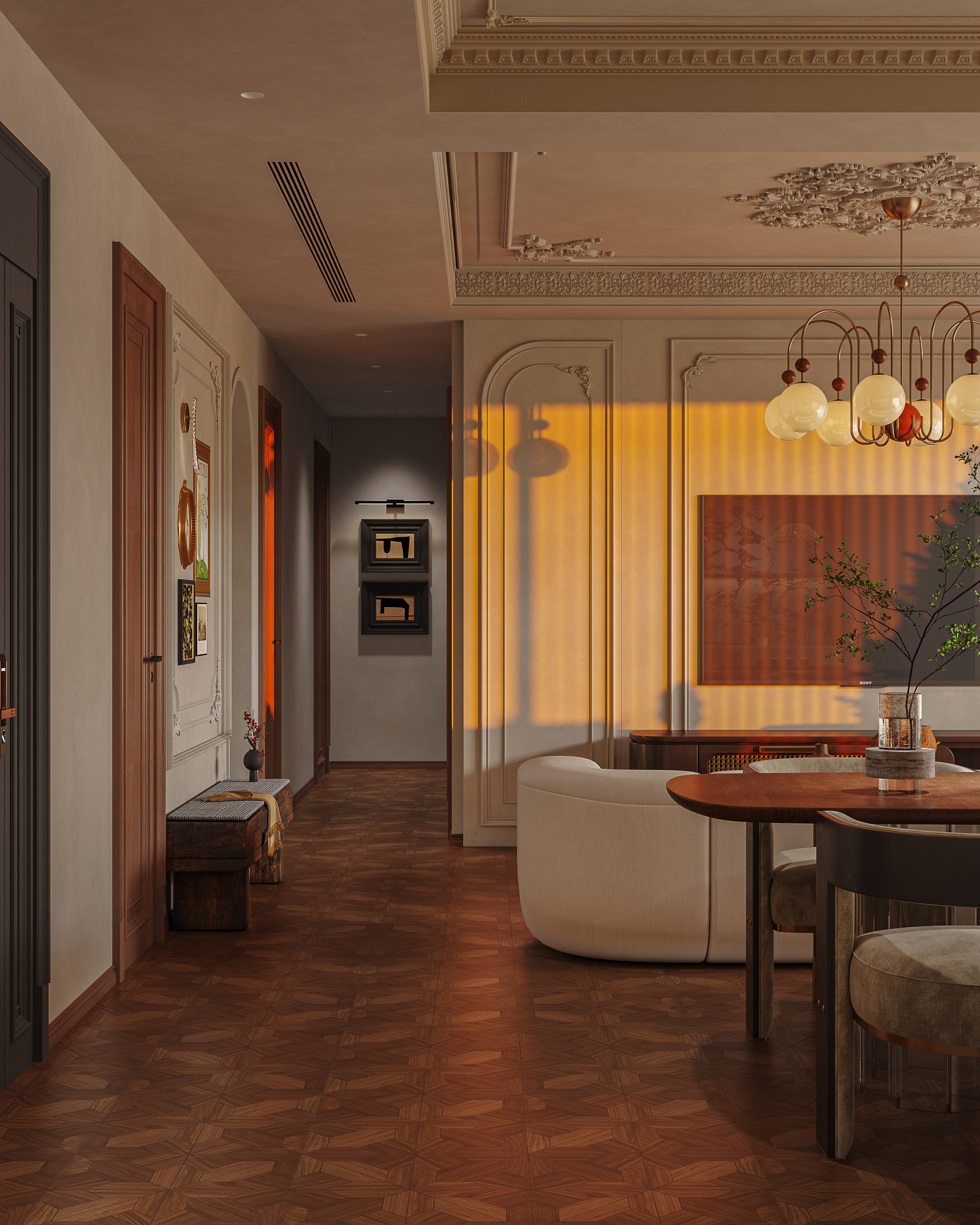 整個空間以米色和棕色為主色調,米色作為主墻色和家具的基色,棕色則通過木質家具、地板以及裝飾品中的點綴,這兩種顏色相互交織,整體設計更加飽滿且富有層次感。