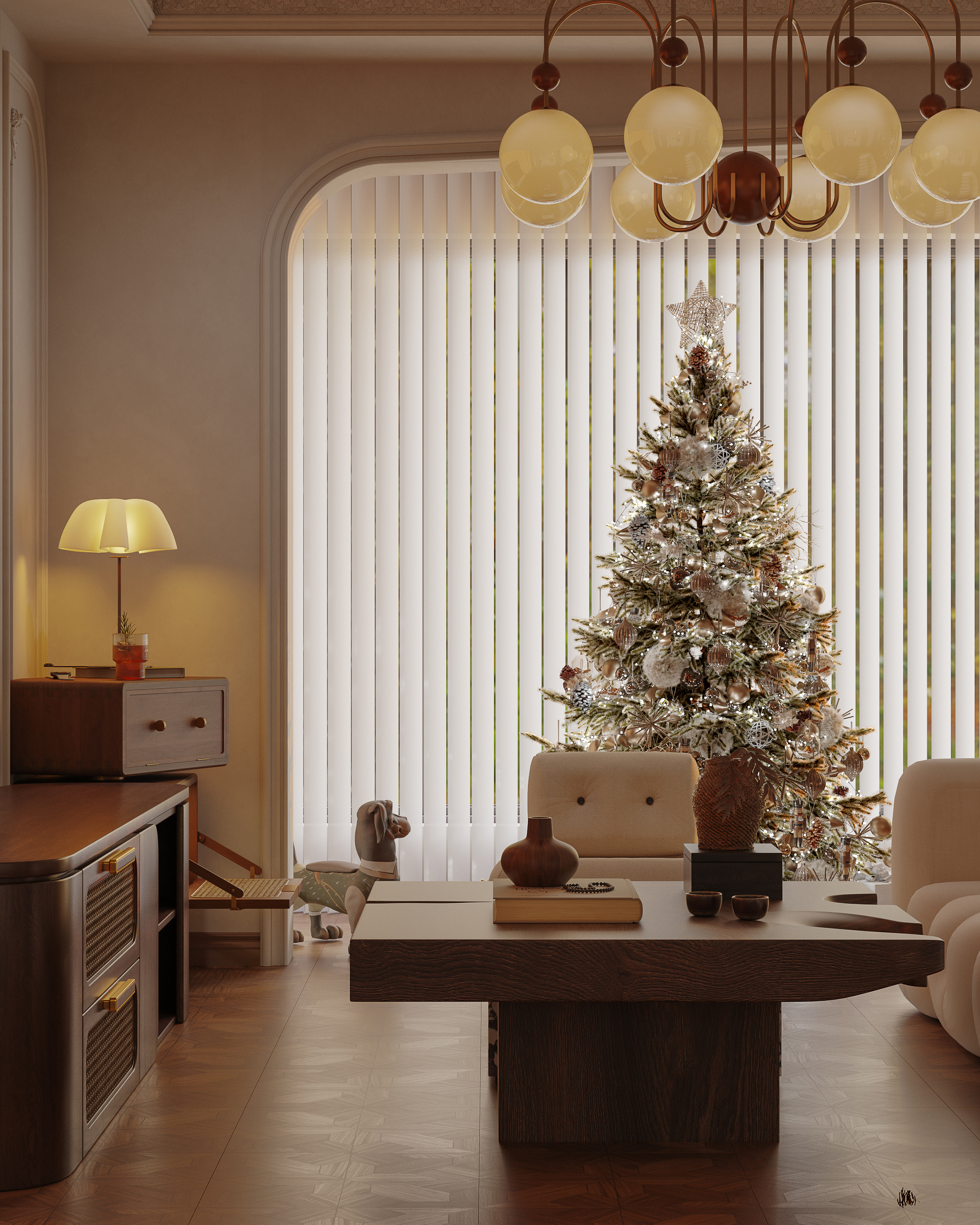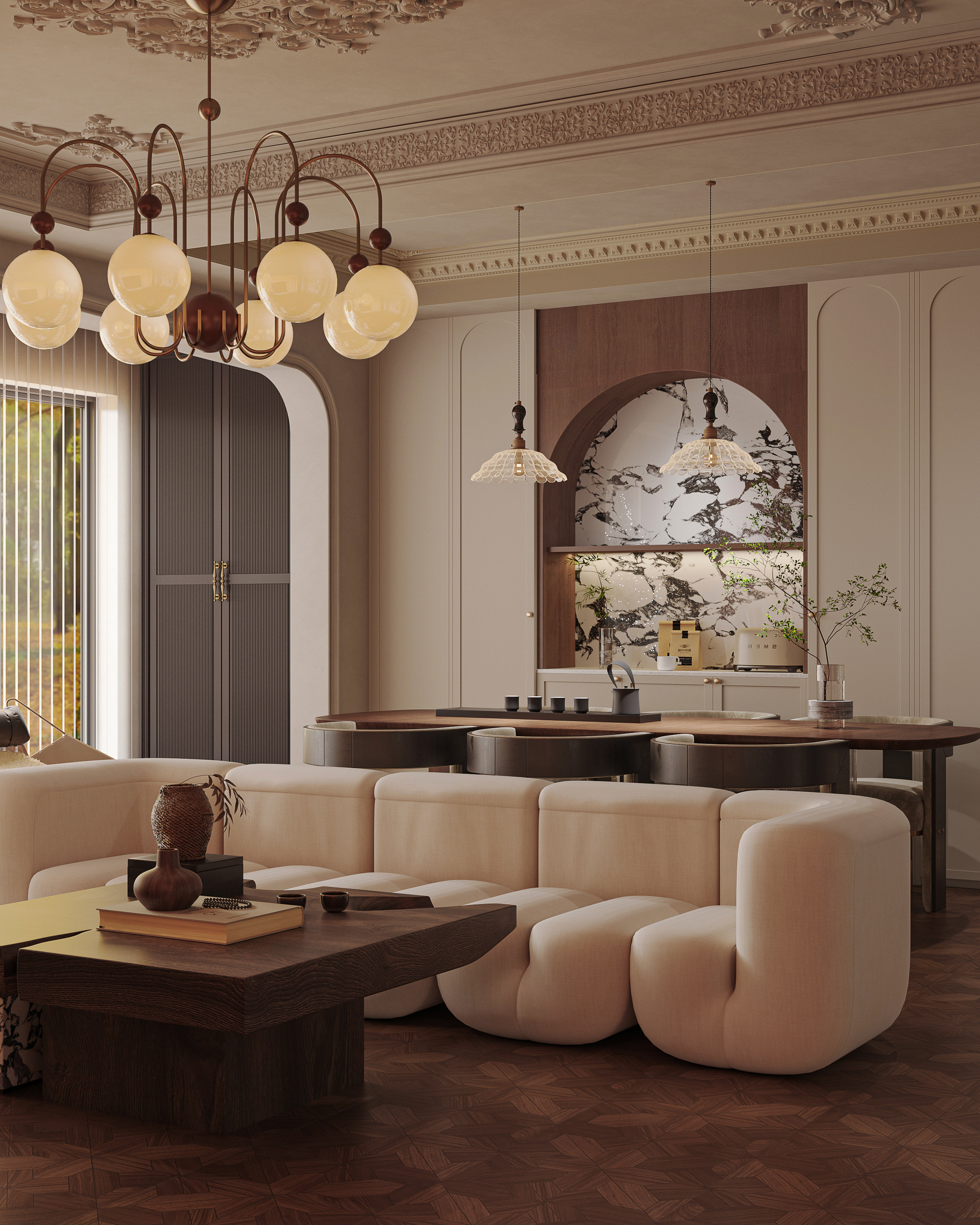 客廳與陽臺用拱形門相連,線條柔美而優雅,讓室外的光線與景致自然過渡至室內,營造出一種溫馨而浪漫的氛圍。