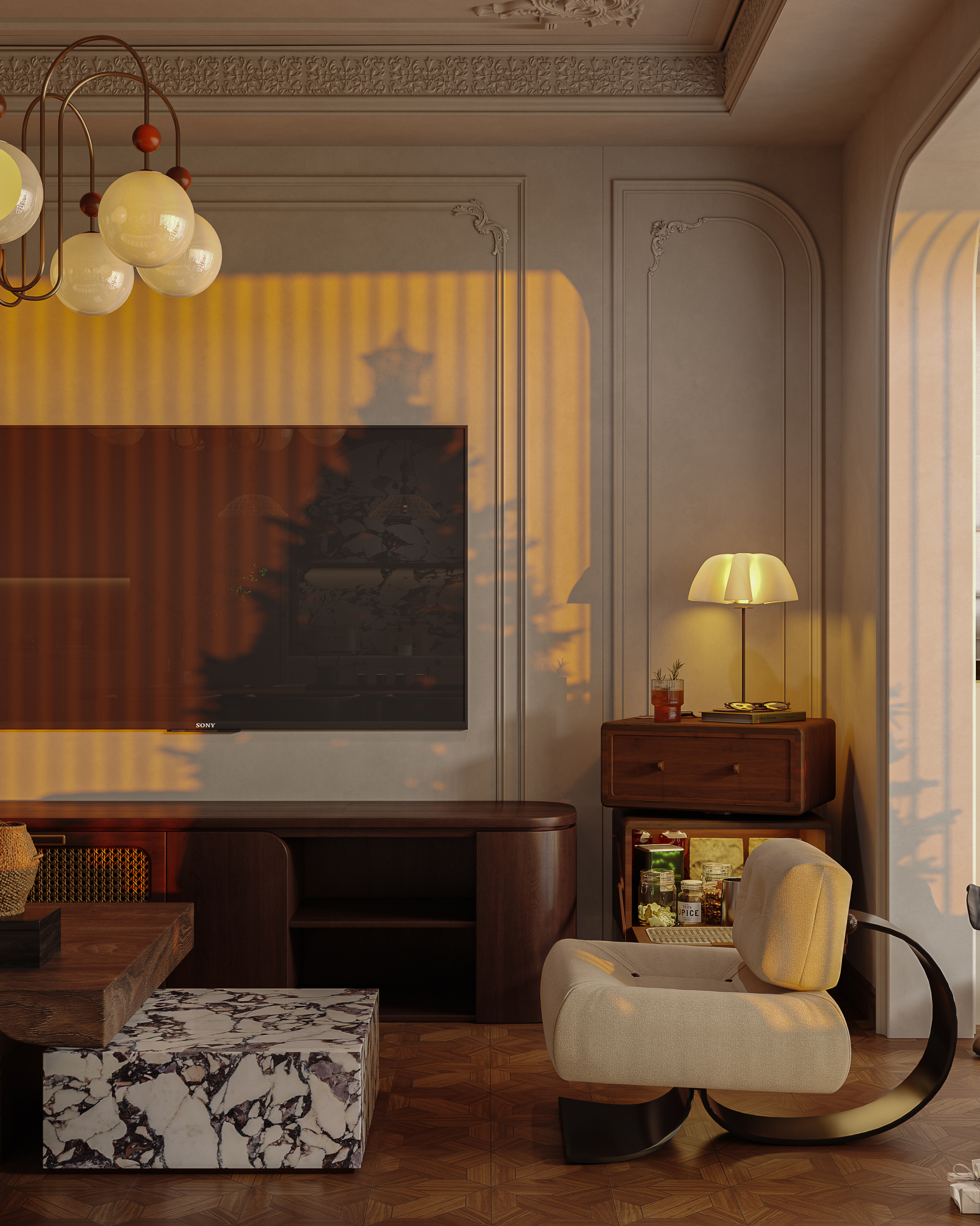 吊燈的繁復設計與水晶吊墜閃爍著微光,極致的優雅,而壁燈與落地燈則以其柔和的光暈,為客廳的每一個角落都帶來了溫馨與舒適。