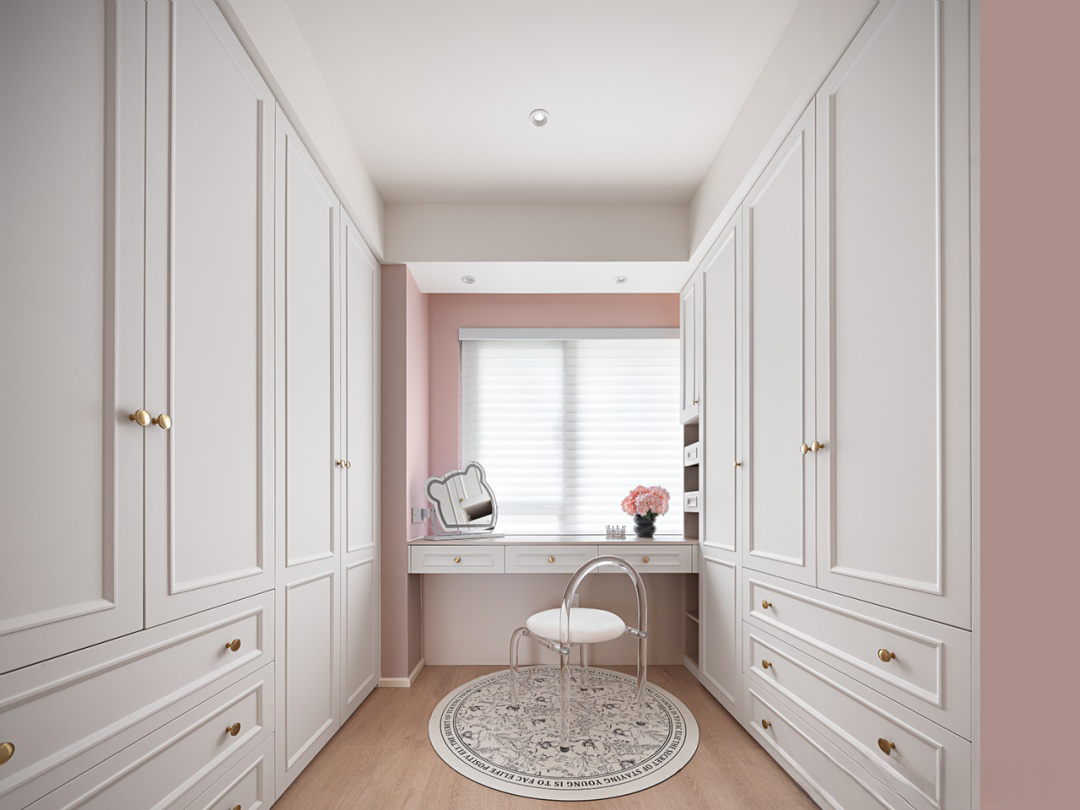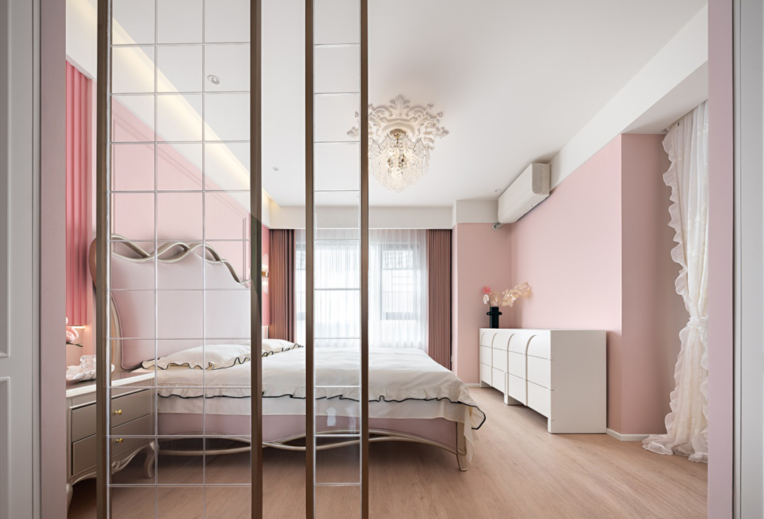 整體色調以粉色與白色為主,粉色作為主色調,為空間披上了一層溫柔的面紗,白色作為輔助色,墻面、天花板、衣柜以及梳妝臺等家具,與粉色的床品、窗簾等軟裝相互映襯,使得整個主臥看起來既簡潔又不失層次感。