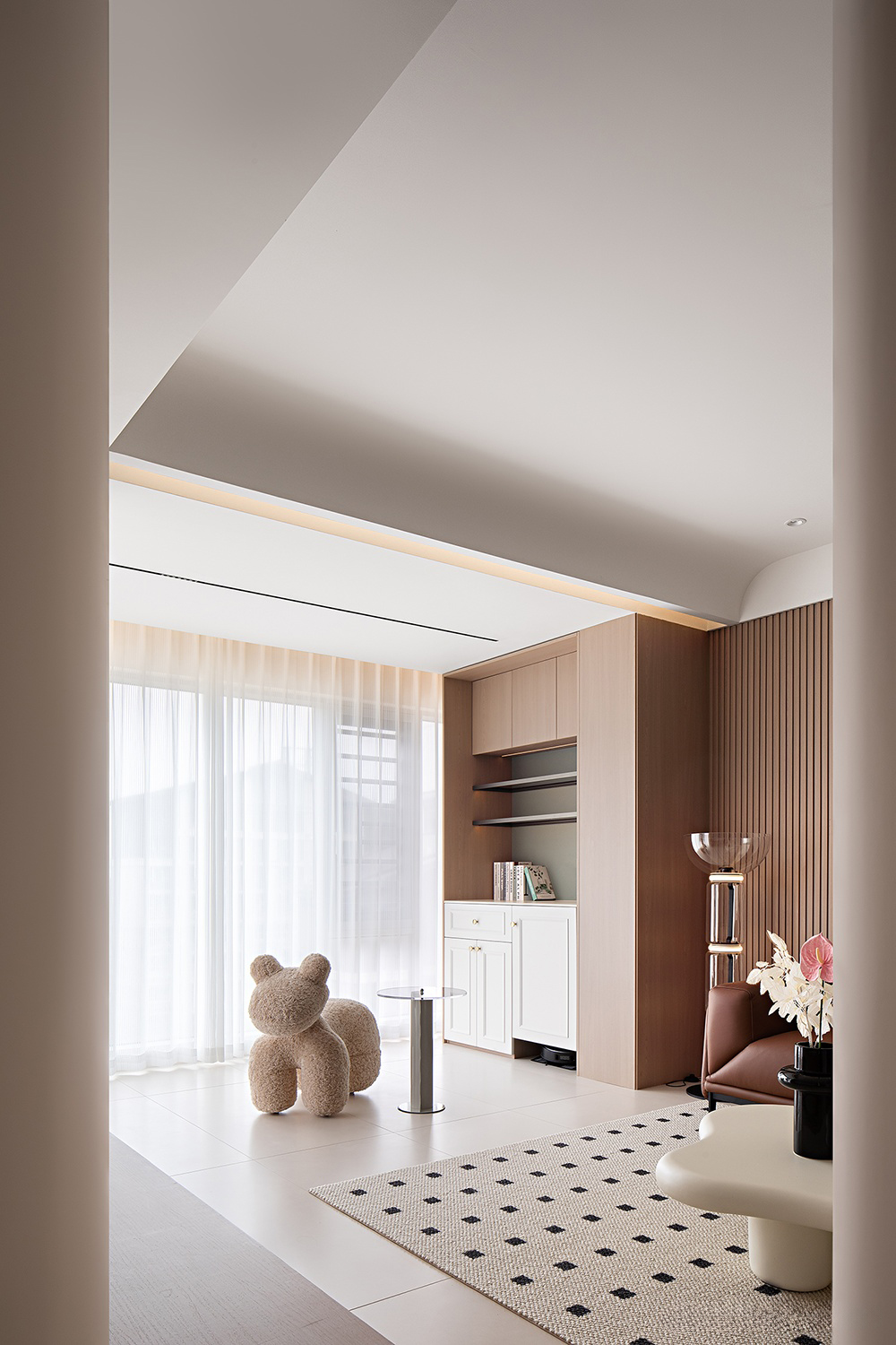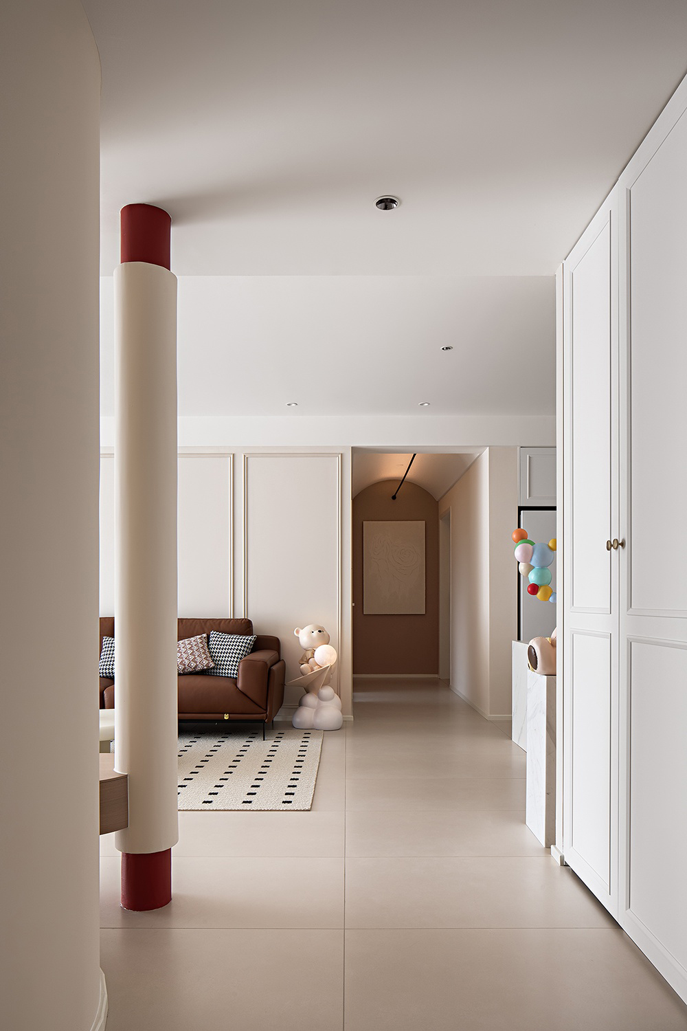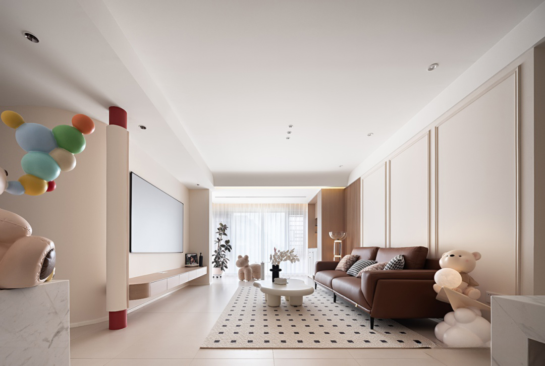 棕色沙發搭配白色茶幾,色彩和諧,營造溫馨氛圍。淺色墻壁與白色地板相映成趣,空間明亮通透。嵌入式燈具點綴天花板,增添光影美感。大理石臺面裝飾獨特,粉色氣球與小熊玩偶增添一抹童真與文藝氣息,整體裝修簡約中透露著不凡品味。