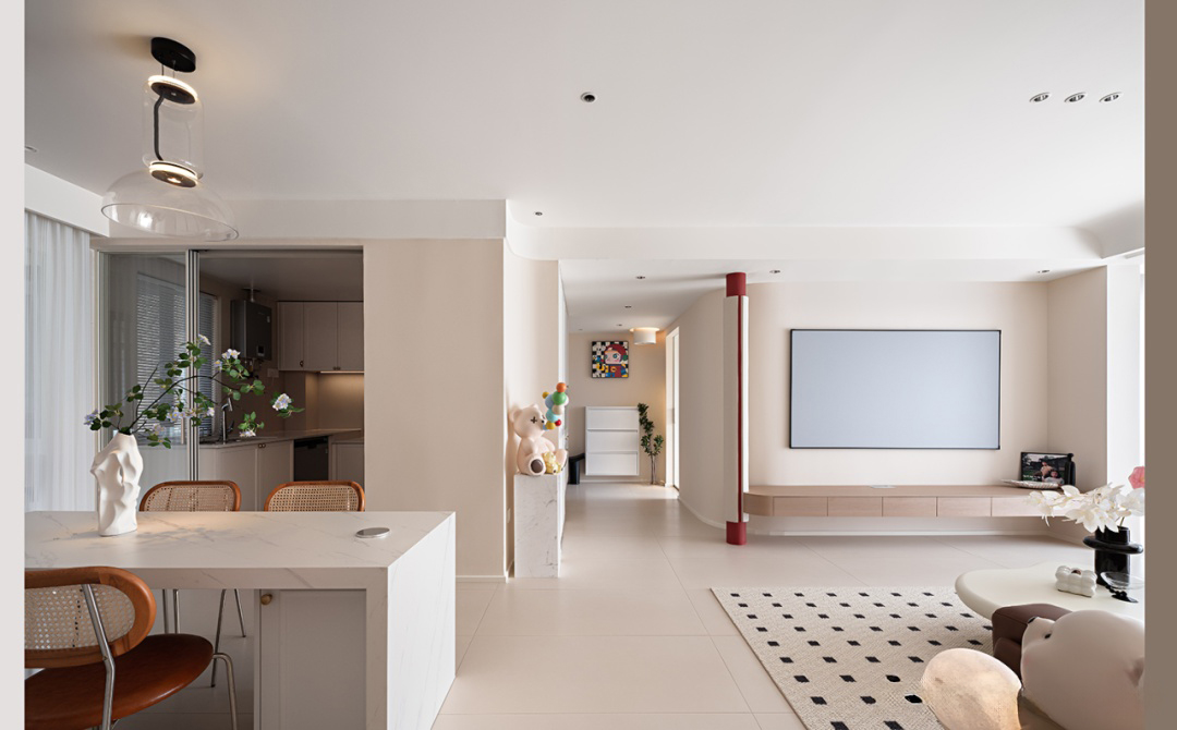 客餐一體,以白色為主色調,營造出明亮寬敞的空間感。大理石材質餐桌設計簡潔實用,搭配木質與金屬材質的椅子,展現材質對比美,桌上精致的花瓶,營造出濃厚的文藝氛圍,整體設計既符合現代審美,又不失溫馨舒適的用餐體驗。
