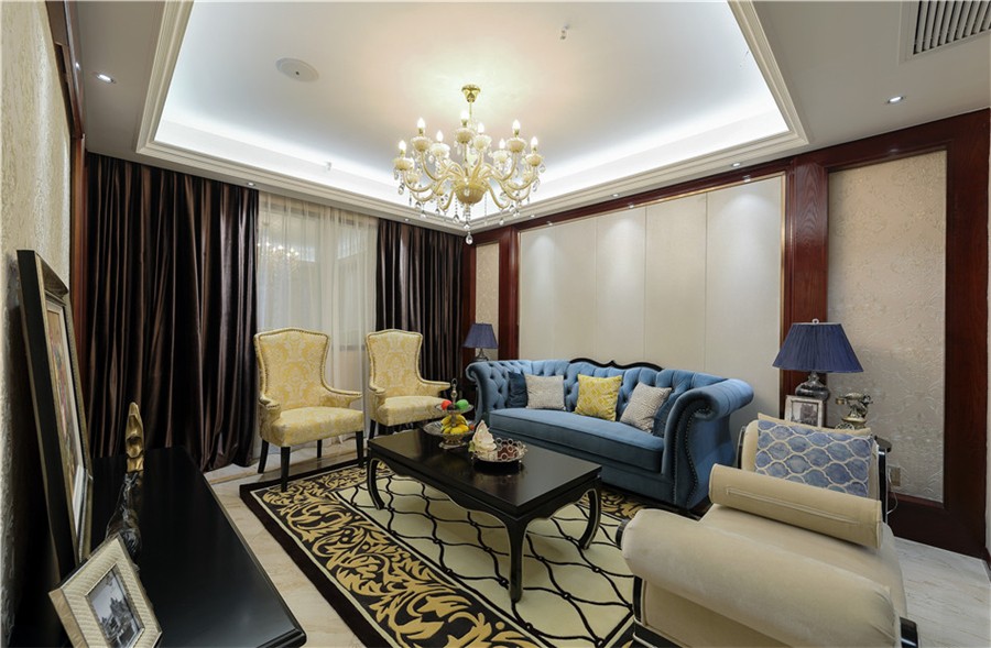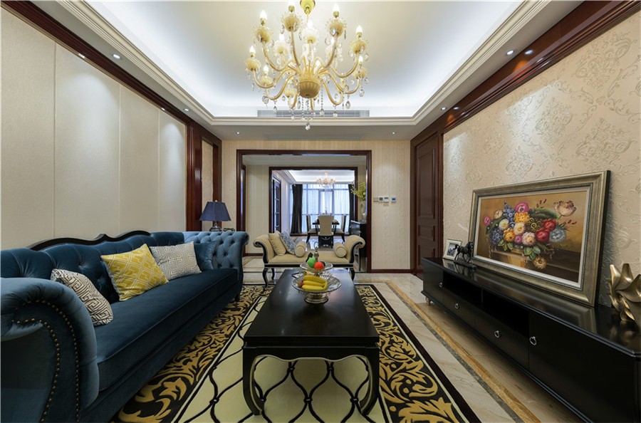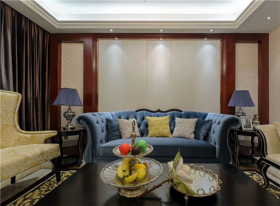 客廳里藍色的天鵝絨沙發很有質感,整個空間給人一種成熟穩重的感覺。