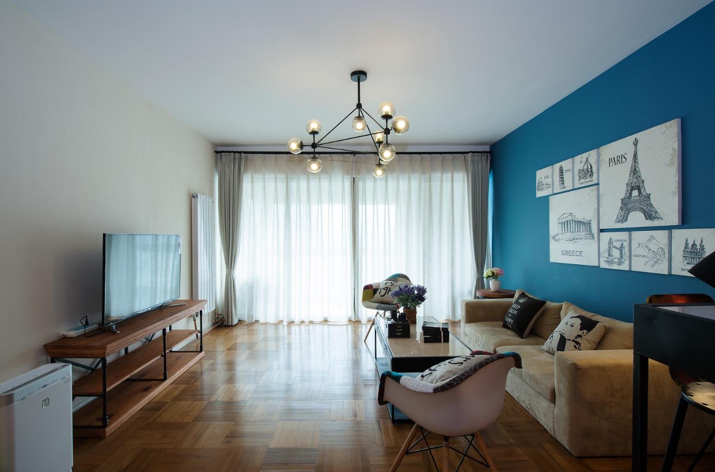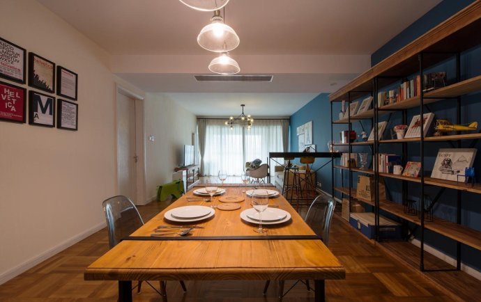 客廳和餐廳同屬一個空間,中間沒有設置任何隔斷,所以看起來十分通透敞亮。藍色的背景墻抓人眼球,簡單又時尚。