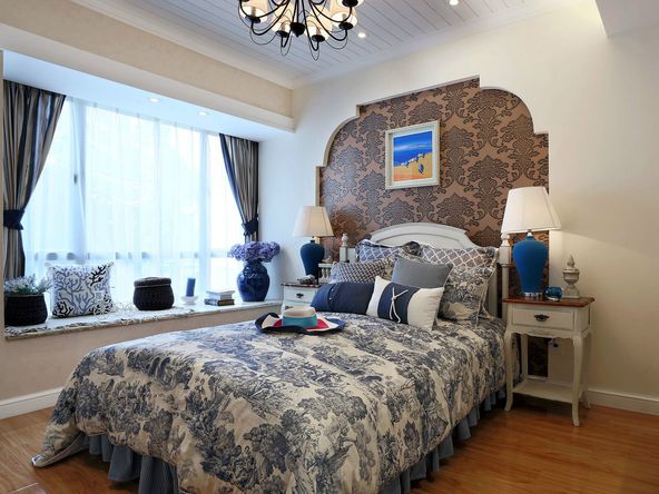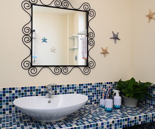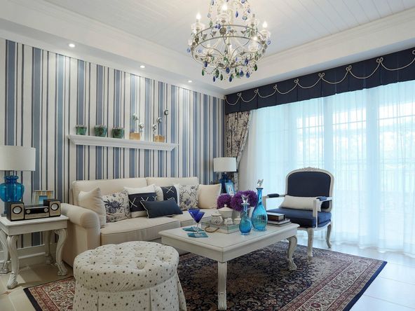 藍色是地中海風格里最不可缺少的元素,客廳沙發背景墻用的是藍白條紋,廚房是水藍色的瓷磚搭配以純白色的櫥柜,衛生間用的是馬賽克的瓷磚來鋪設盥洗臺,選用的瓷磚依舊是以藍色為主。藍色會給人一種放松的舒適感,整體的氛圍也沒有那么嚴肅,有一種活潑與輕快。