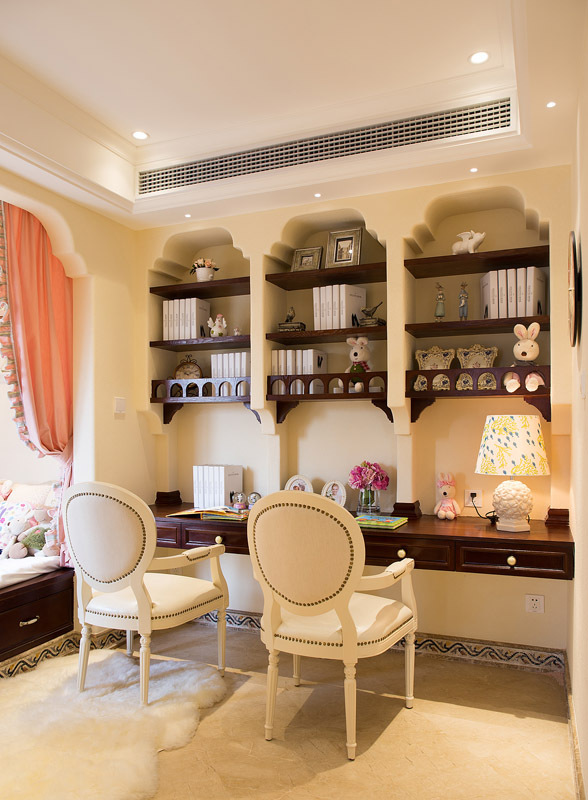 這一套田園風(fēng)格沒有運用太過花哨的裝飾,整體上有點向簡約風(fēng)靠攏,但是也很有田園風(fēng)的特色:悠閑、舒暢、自然。書房的裝修也很有特色,用壁龕的設(shè)計代替櫥柜,長長的書桌滿足兩個人同時使用的需求,飄窗上簡單地布置了一下,成了一個舒適的休閑空間。