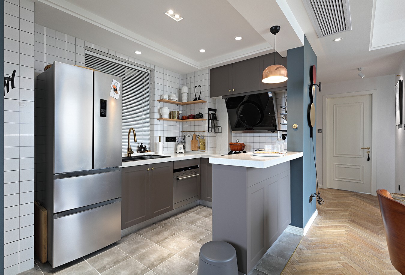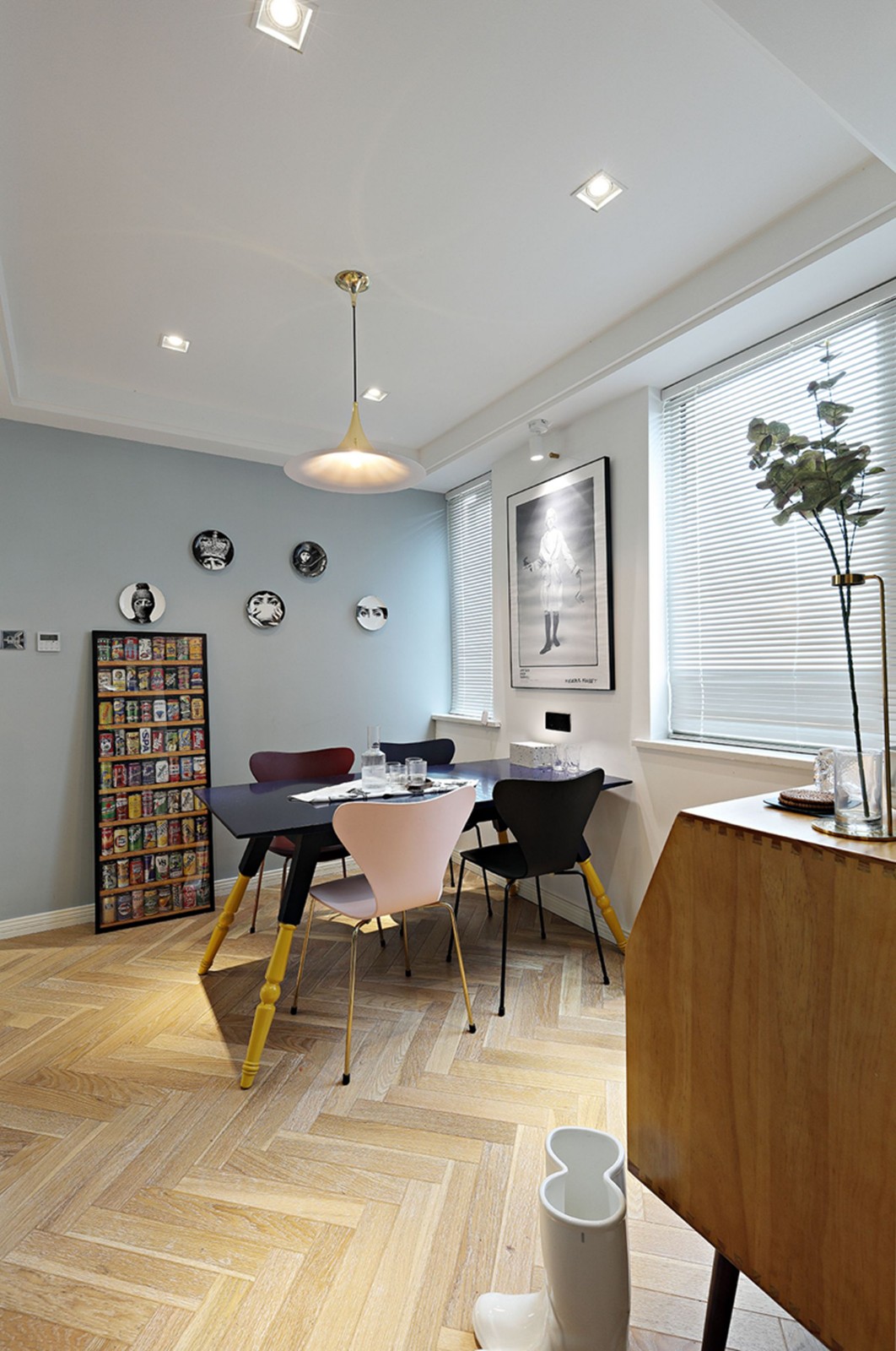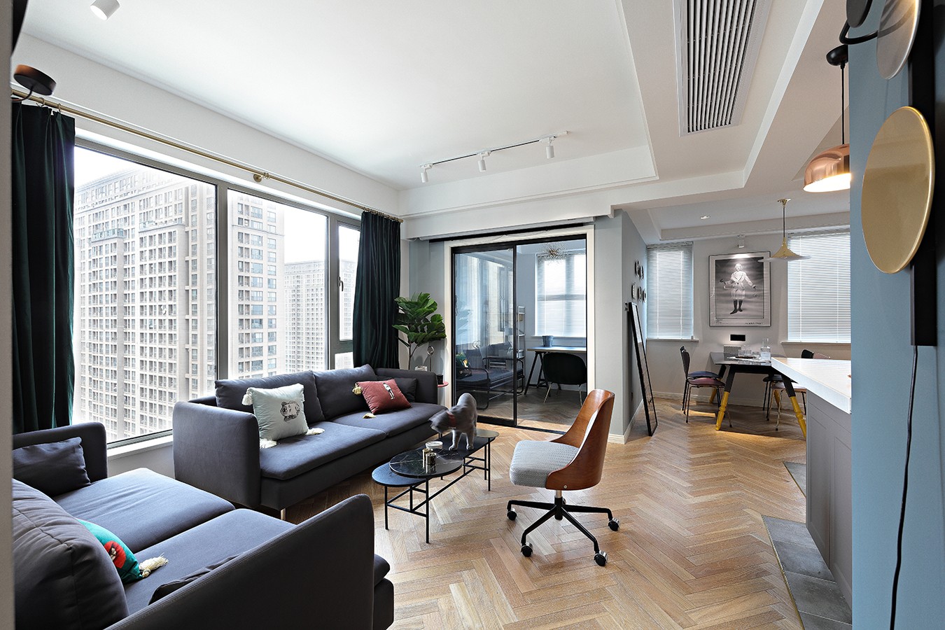 客廳、餐廳和廚房都處于同一個(gè)空間,沒有任何隔斷,所以客廳的光輕而易舉地就能投進(jìn)廚房,照亮餐廳,整個(gè)家也開闊明亮了不少。你一定想不到,客廳的旁邊是一個(gè)小小的書房,雖然沒有設(shè)置書柜,但是平時(shí)可以在這里辦公,玻璃推拉門的設(shè)計(jì)美觀又透亮,完全不用擔(dān)心書房光線不足。