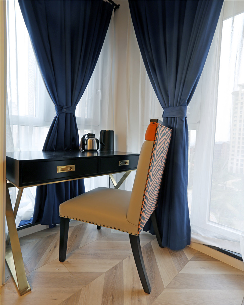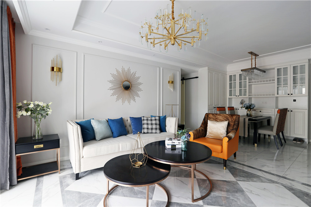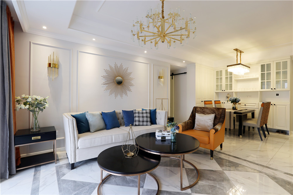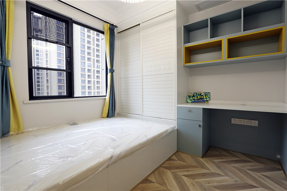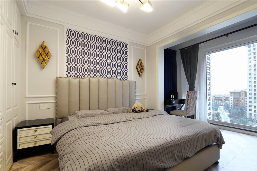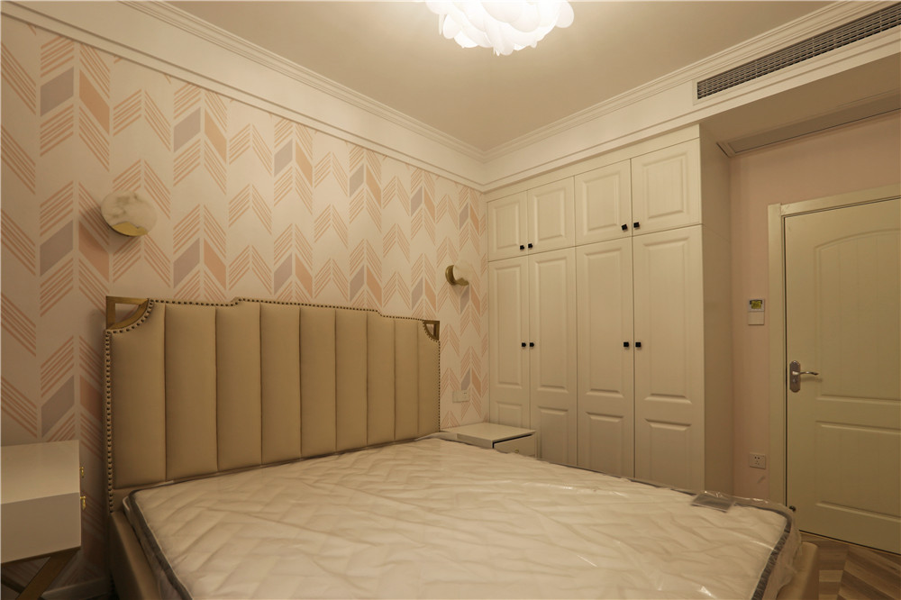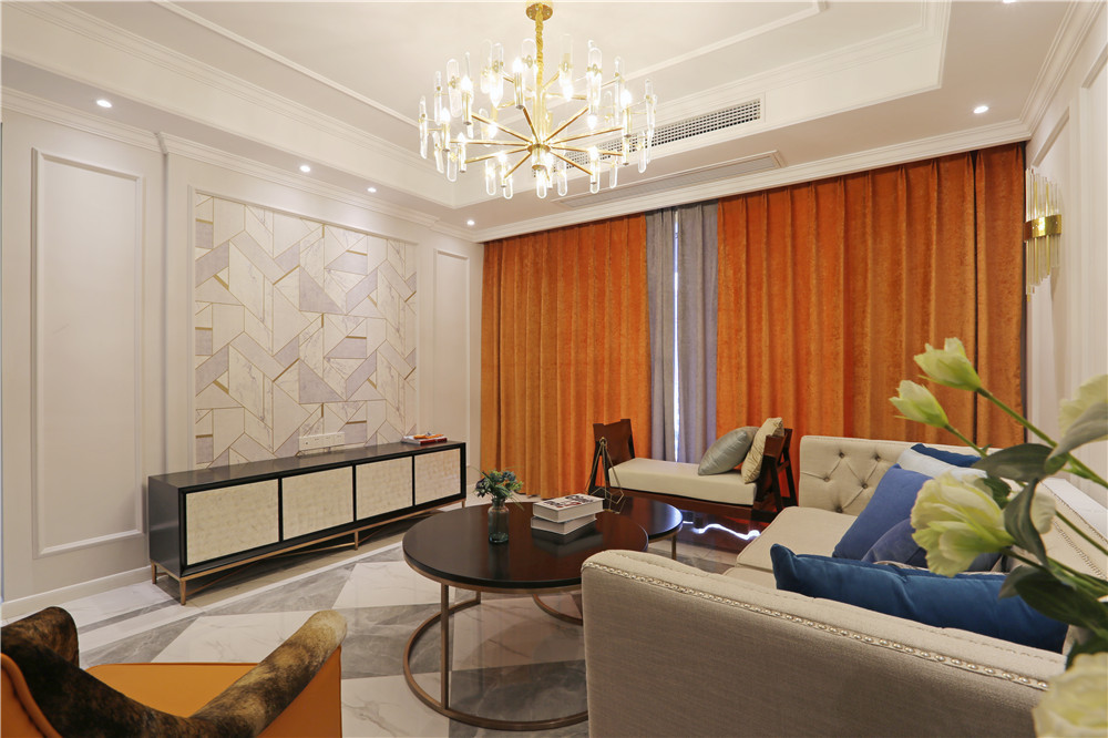 這一套美式風格用了較為鮮艷的橘紅色做裝飾,這一套橘紅色的窗簾放在客廳里很吸引眼球,卻不會顯得突兀。臥室的主色調用的是一種比較淺的黃色,跟暖黃色的燈光搭配在一起,打造了出了一個適合休息的空間。