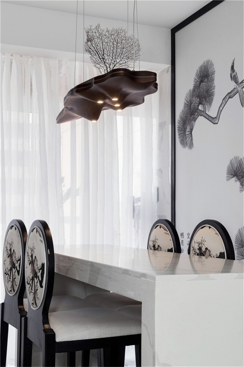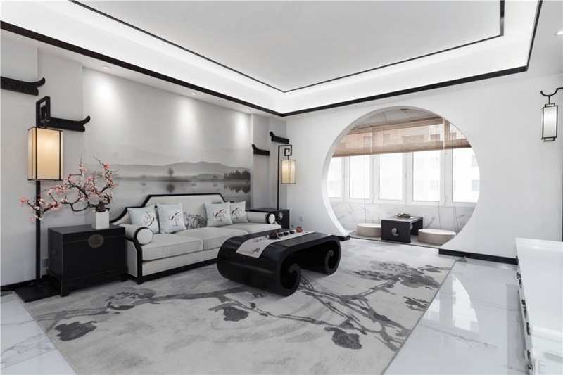 這套新中式風(fēng)格讓原本面積就大的戶(hù)型,變得更為寬敞明亮,陽(yáng)臺(tái)和客廳之間,用景墻做隔斷,就像是把蘇州園林換了一種方式搬回了家中。雖然整個(gè)房屋的主色調(diào)是最簡(jiǎn)單的白色,但是一點(diǎn)都不會(huì)單調(diào),反而有一種水墨畫(huà)的感覺(jué)。
