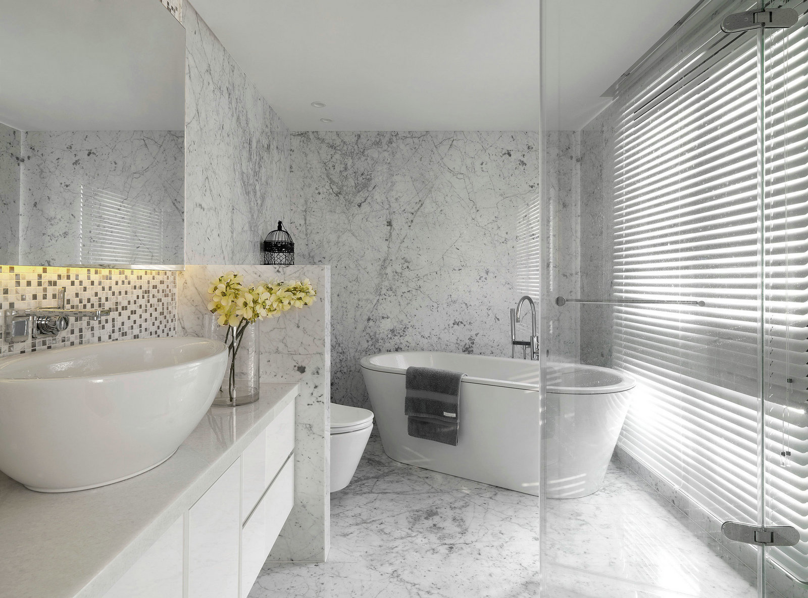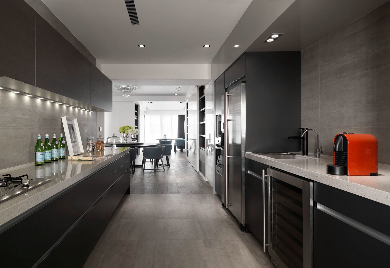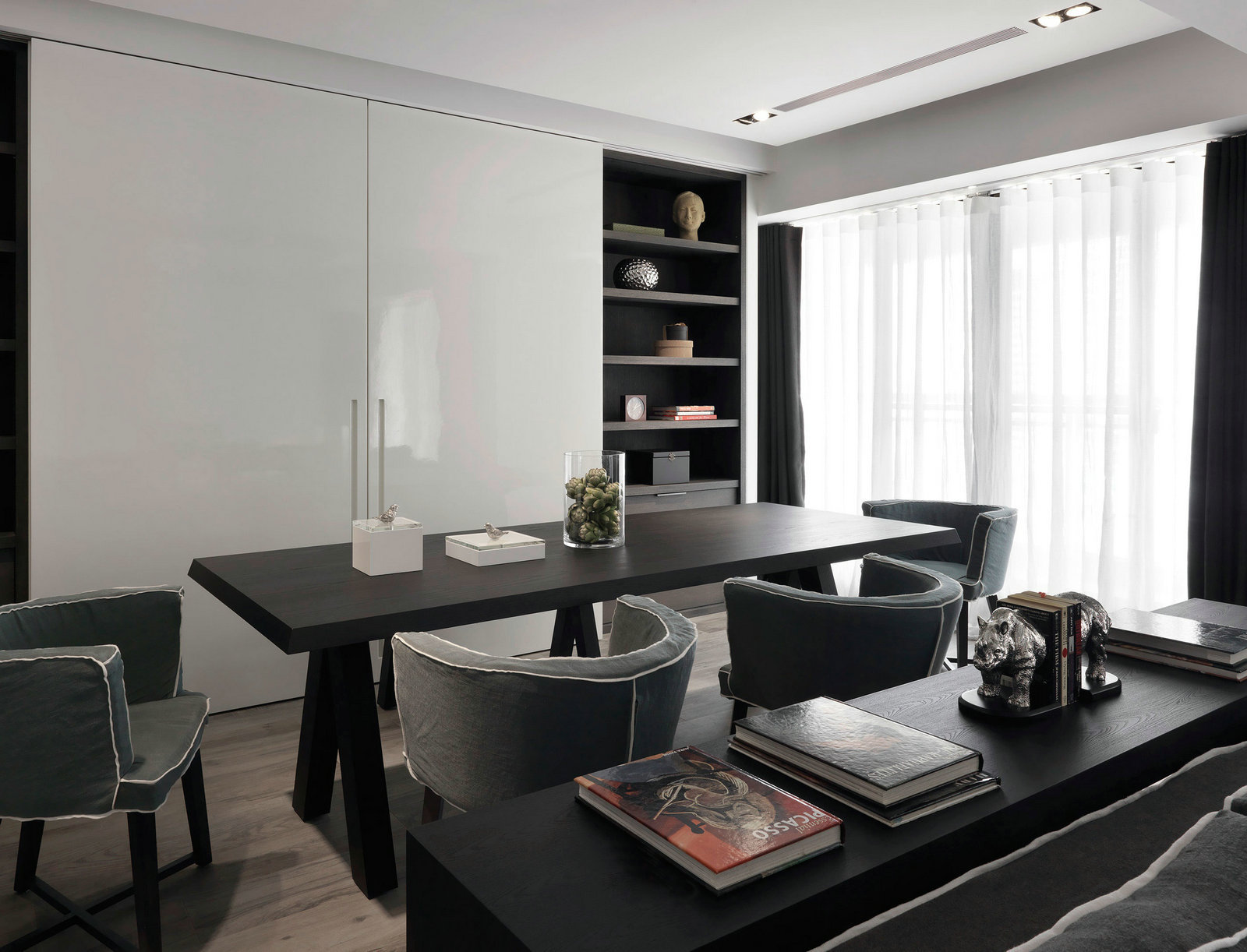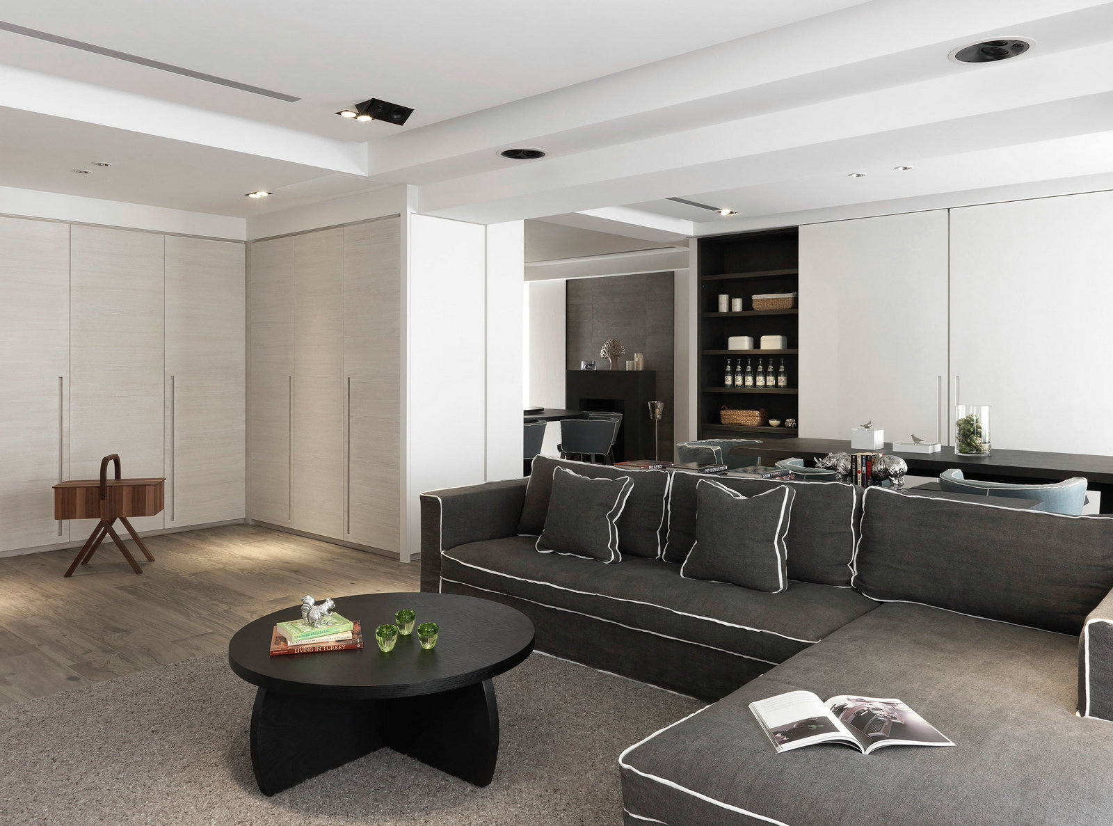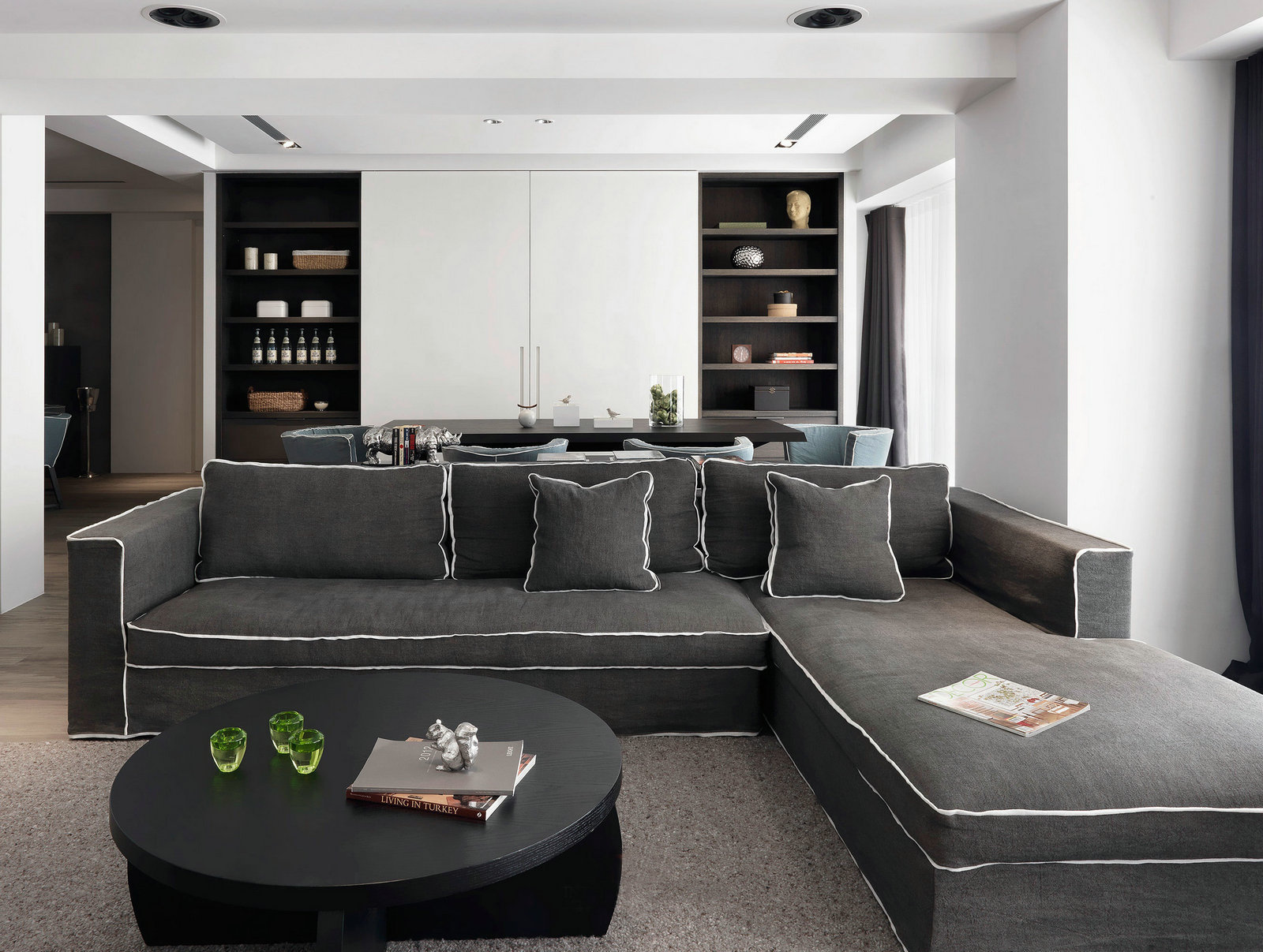 深灰色和白色是這套三居室的主色調,沉穩大氣,簡單舒適,比起設計的觀賞性,設計師更專注于設計的實用性。沙發柔軟、寬大、舒適,儲物柜編排合理,白色的柜體幾乎要跟墻面融為一體,一點也不顯得擁擠和突兀。