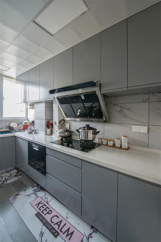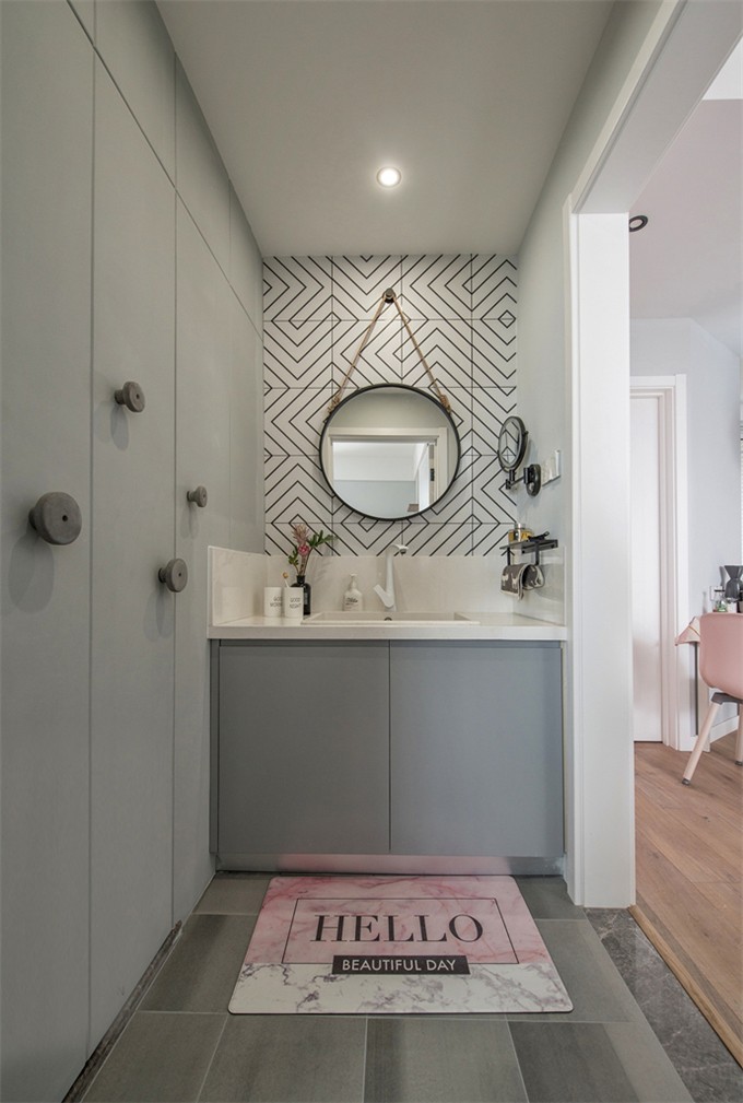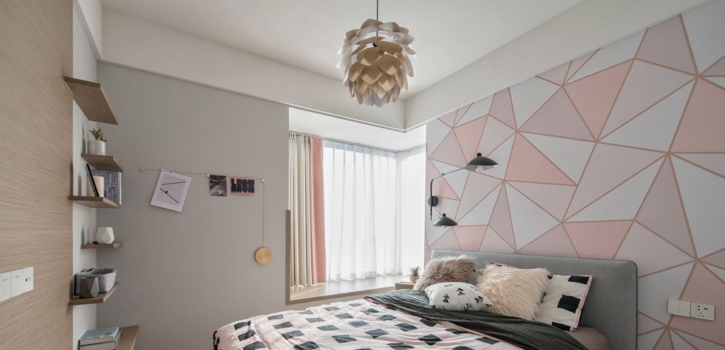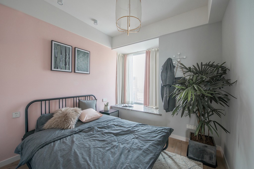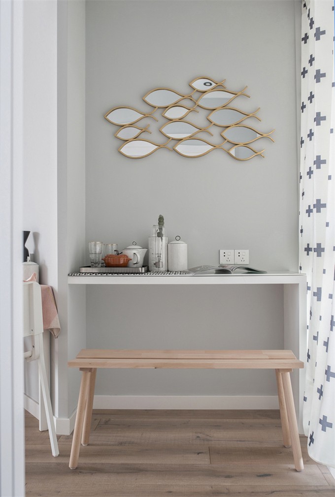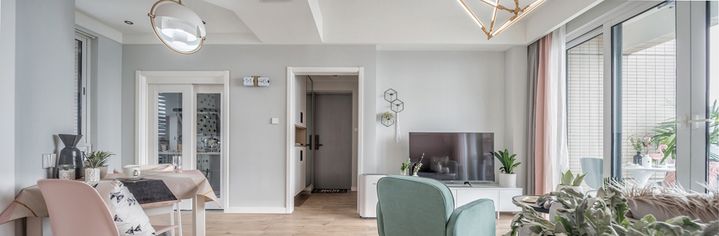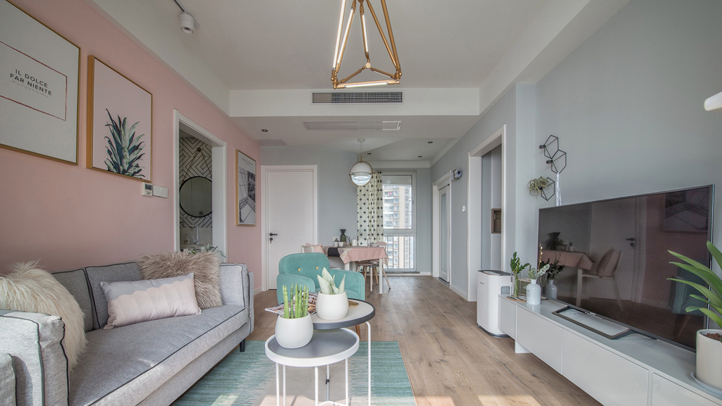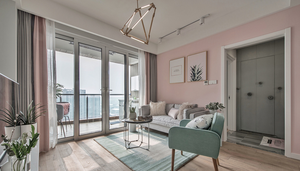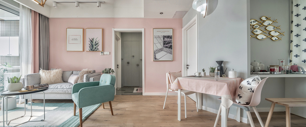 這套北歐風格處處體現著一種夢幻感和小清新,客廳和臥室的背景墻都是用的淺粉色,搭配一點其他顏色的家具,會有一種糖果的感覺。廚房是封閉式的,油煙不會影響到客廳和餐廳,但是為了保證廚房的光線,這里使用的是玻璃推拉門。