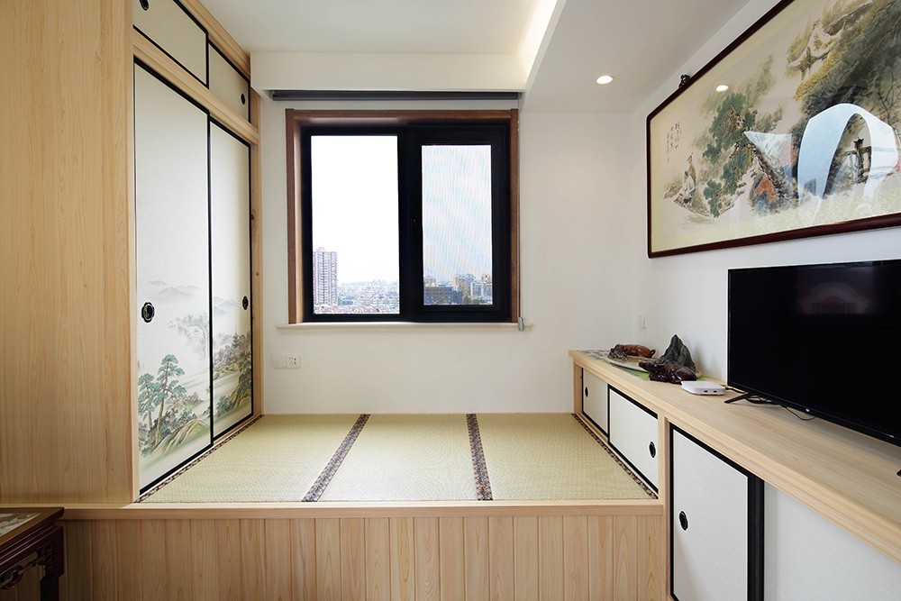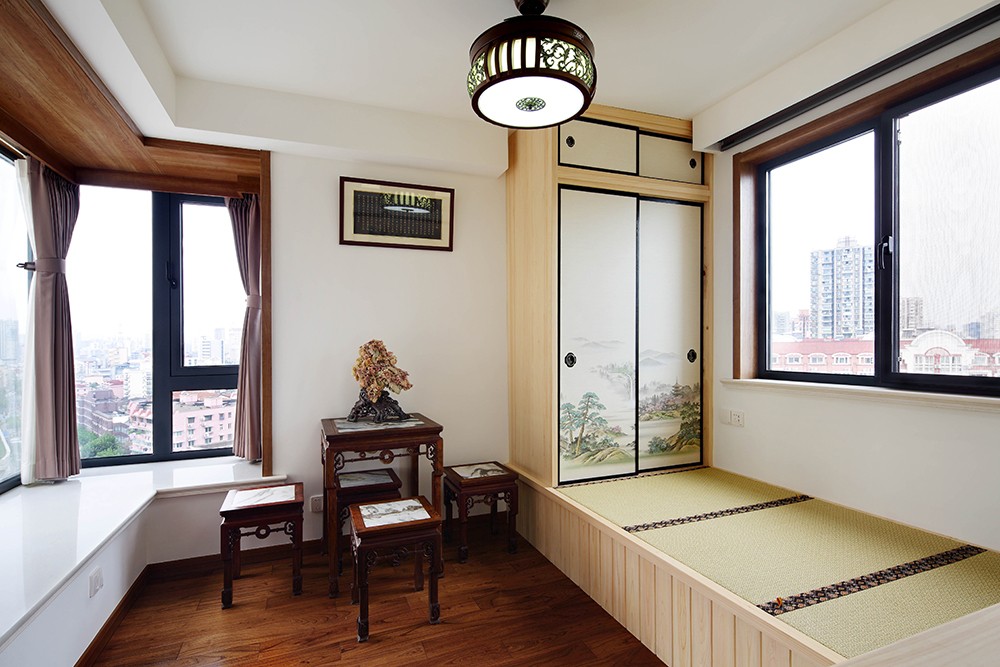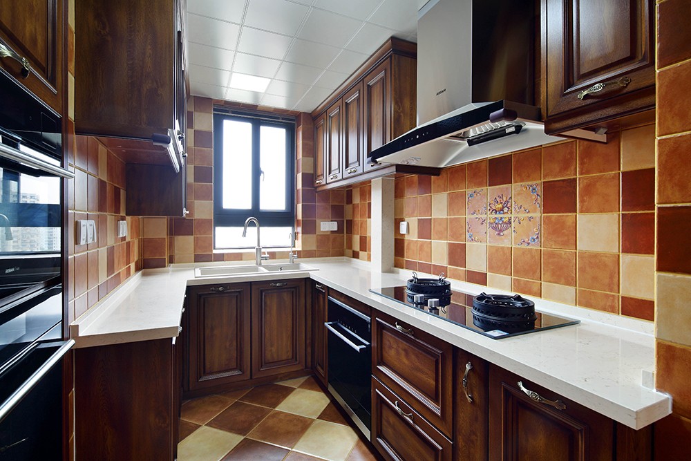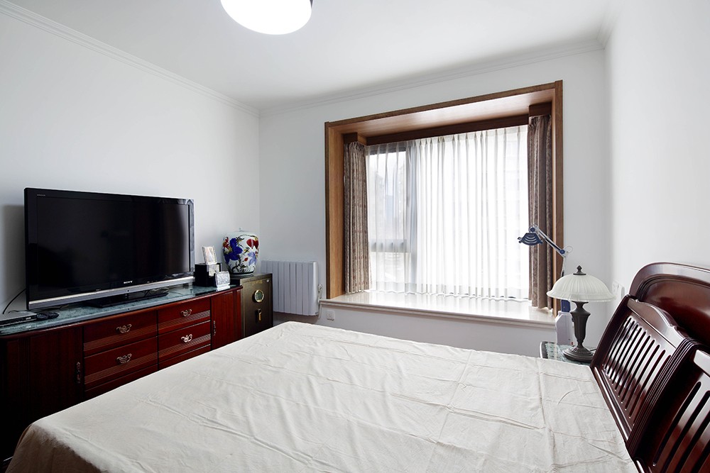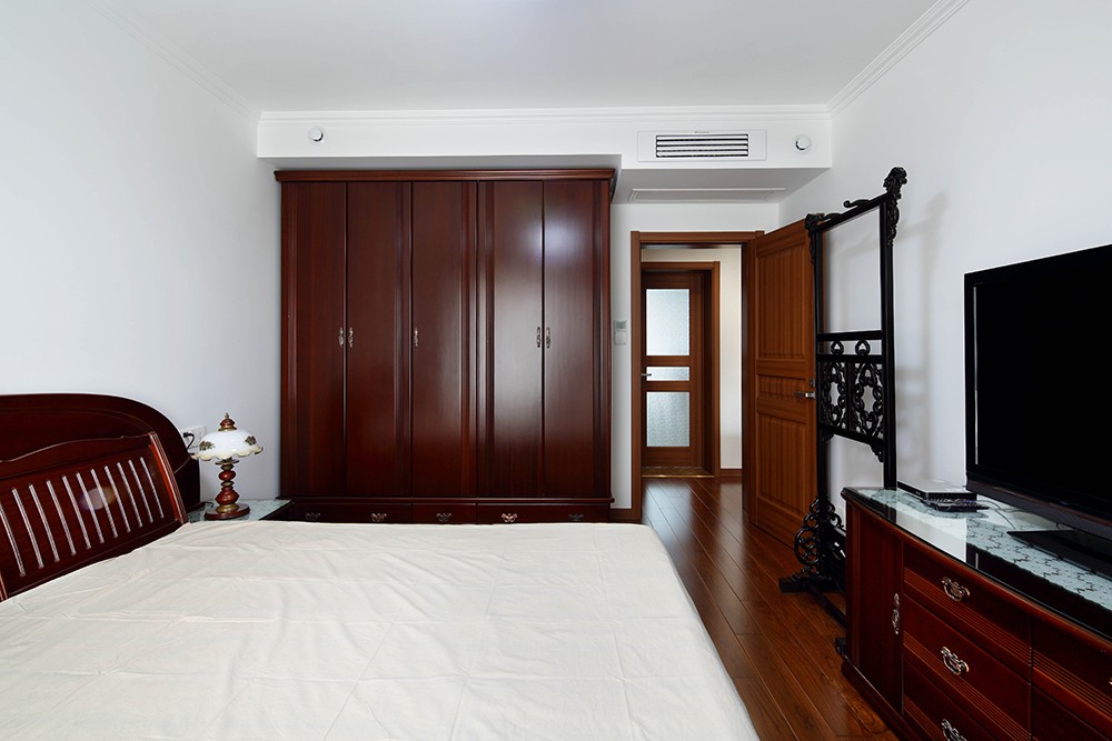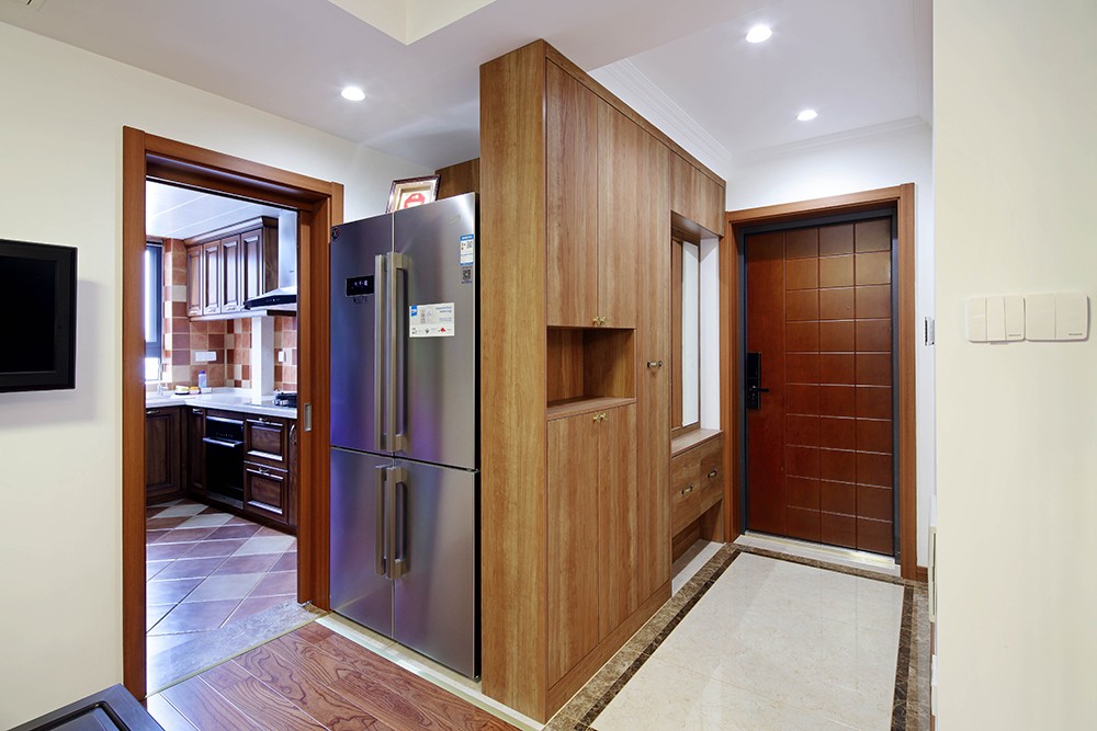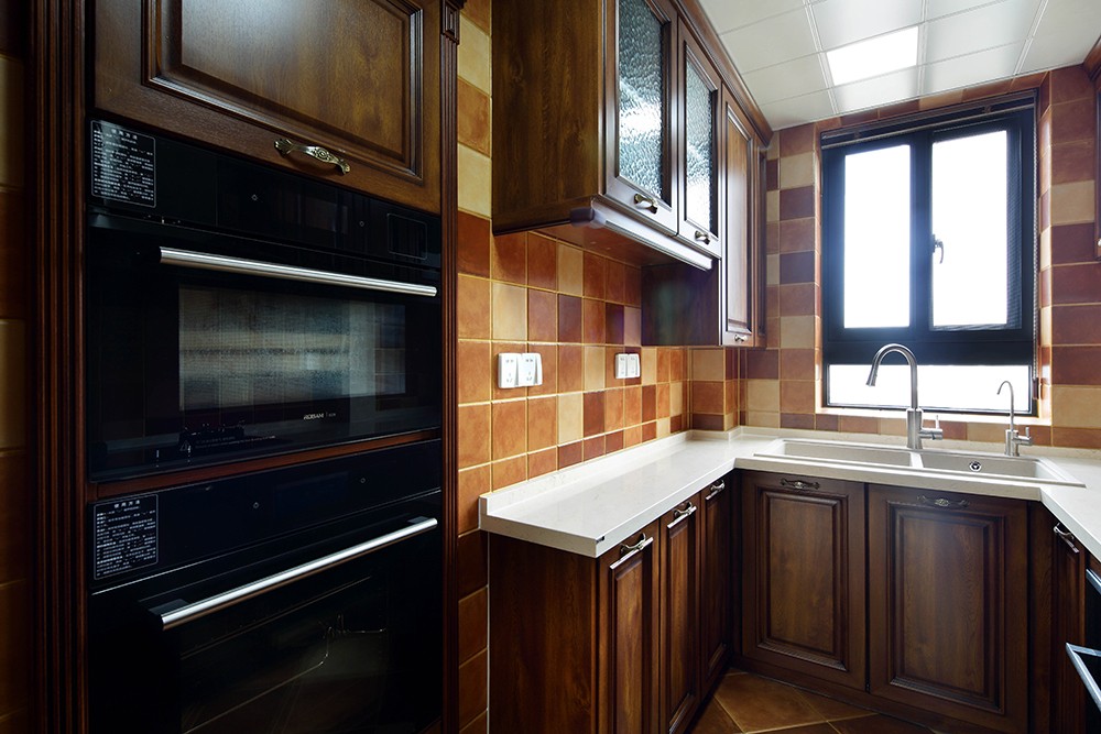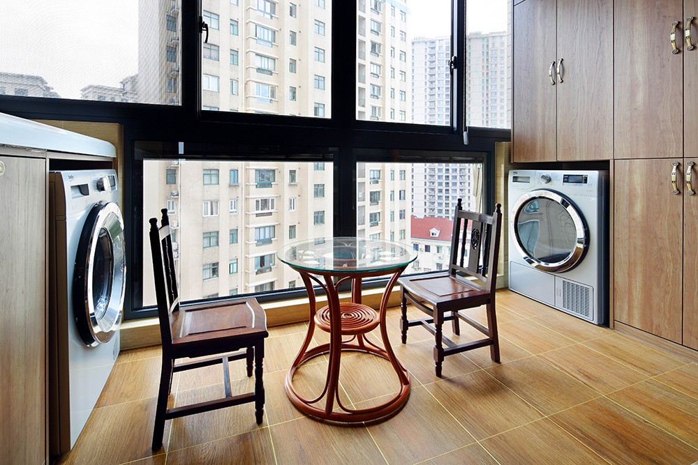 業主從老家帶出了一整套昂貴的紅木家具,所以中式風格自然而然地成為了整個家的主基調。客廳和餐廳并沒有做過多的裝飾,就只是一套紅木家具,就足以體現出中式風的沉穩與厚重。廚房和陽臺都使用了櫥柜內嵌家電的設計,能夠釋放出不少空間。