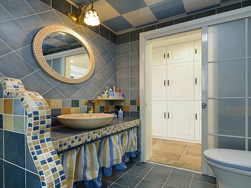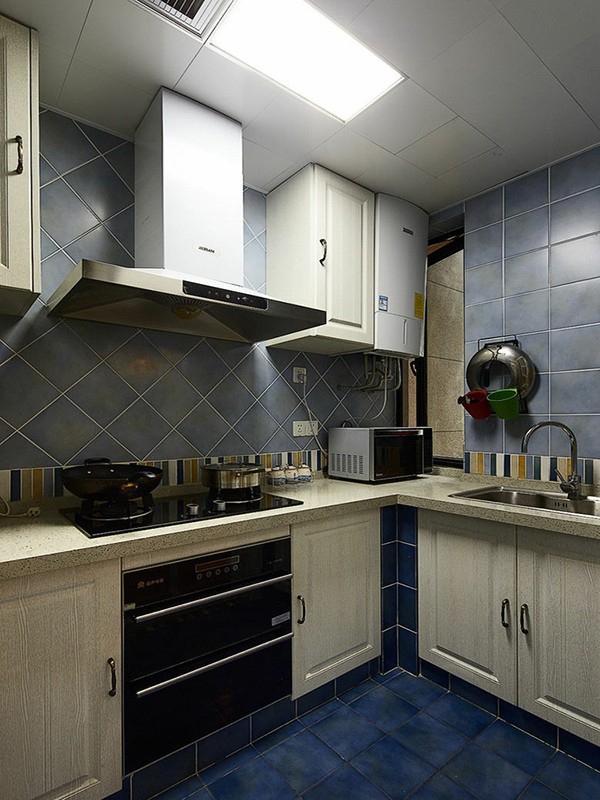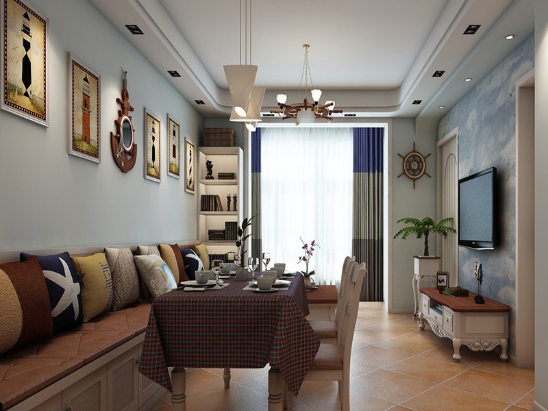 業主喜歡地中海風格的異域風情,在看了幾套裝修案例之后,表示自己不是很喜歡地中海風格常用的海藍色,所以設計師在藍色里加了一點灰調。這套二居室的主色調,與其說是藍色,不如說是更貼近于灰色,有一種低調、成熟、穩重的美感。
