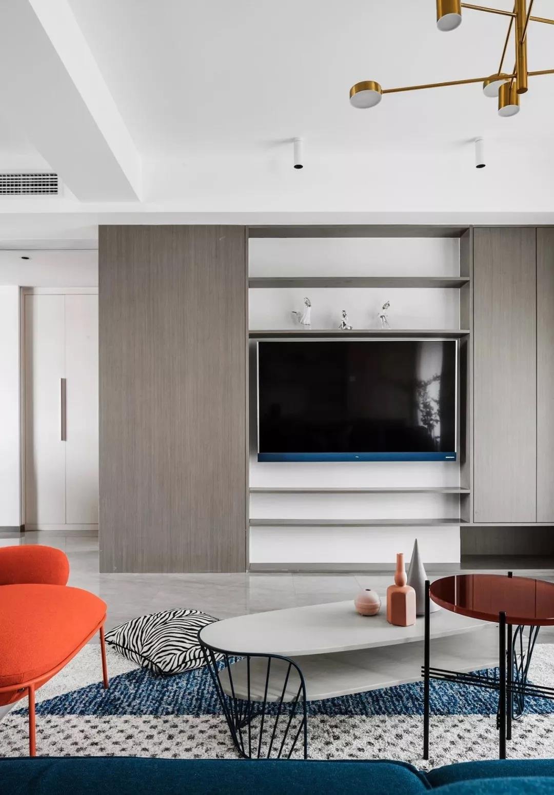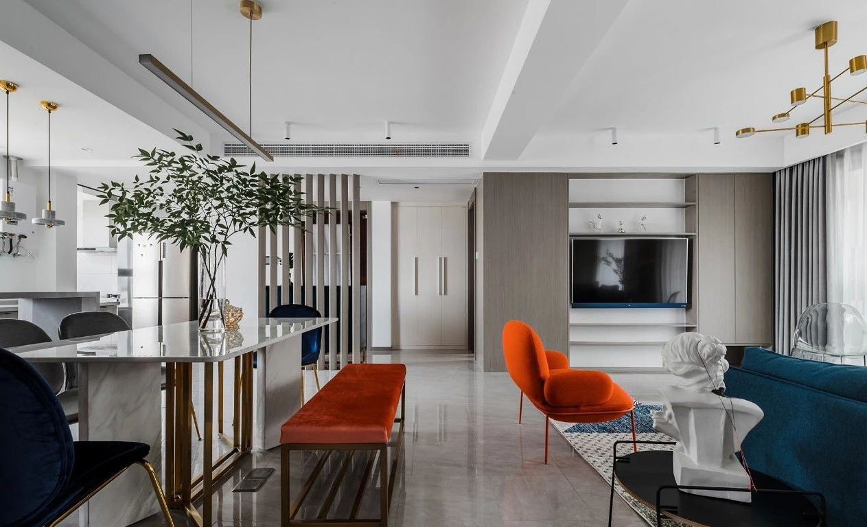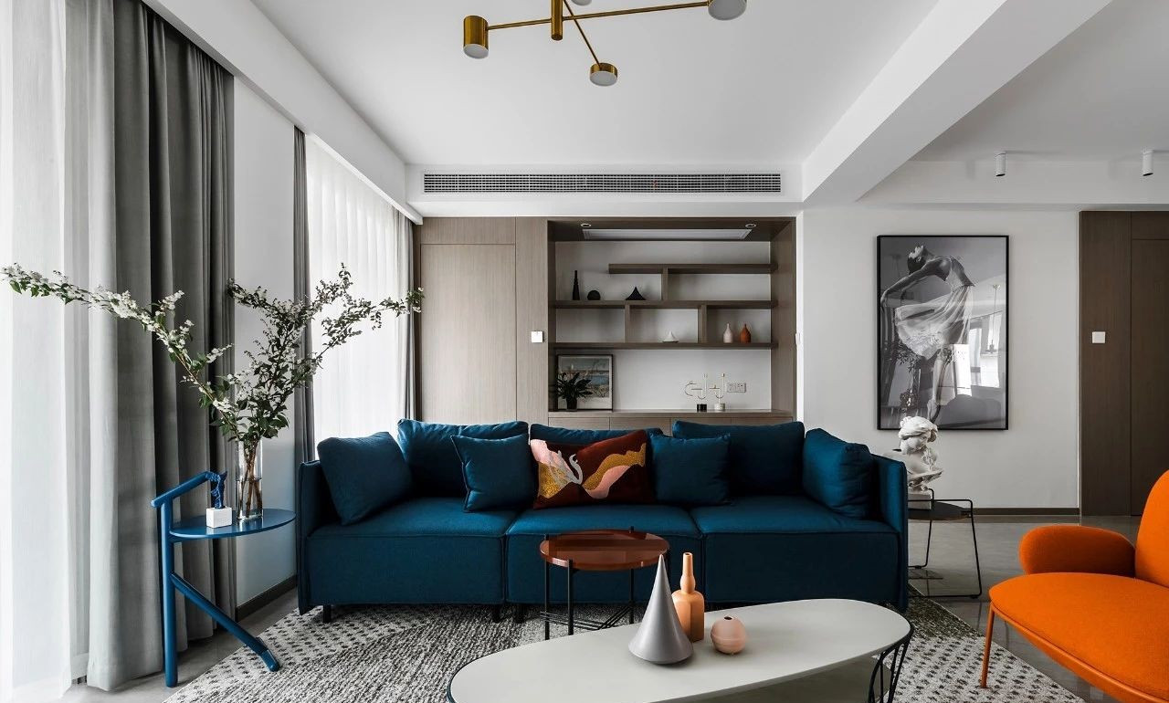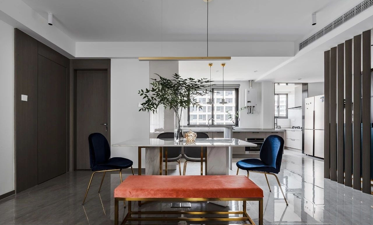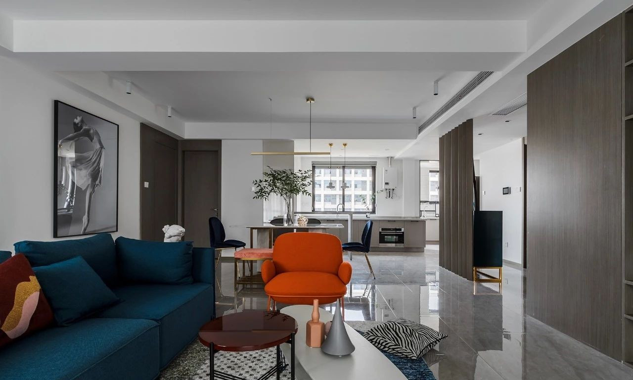 玄關采用斜面格柵結合玄關柜,過道將客餐廳在空間上進行簡潔的軟性分割,撞色的設計為客廳注入活力,整套房屋的設計就是兼具優雅和理性,活潑的同時又帶著一點克制,很適合年輕的業主。