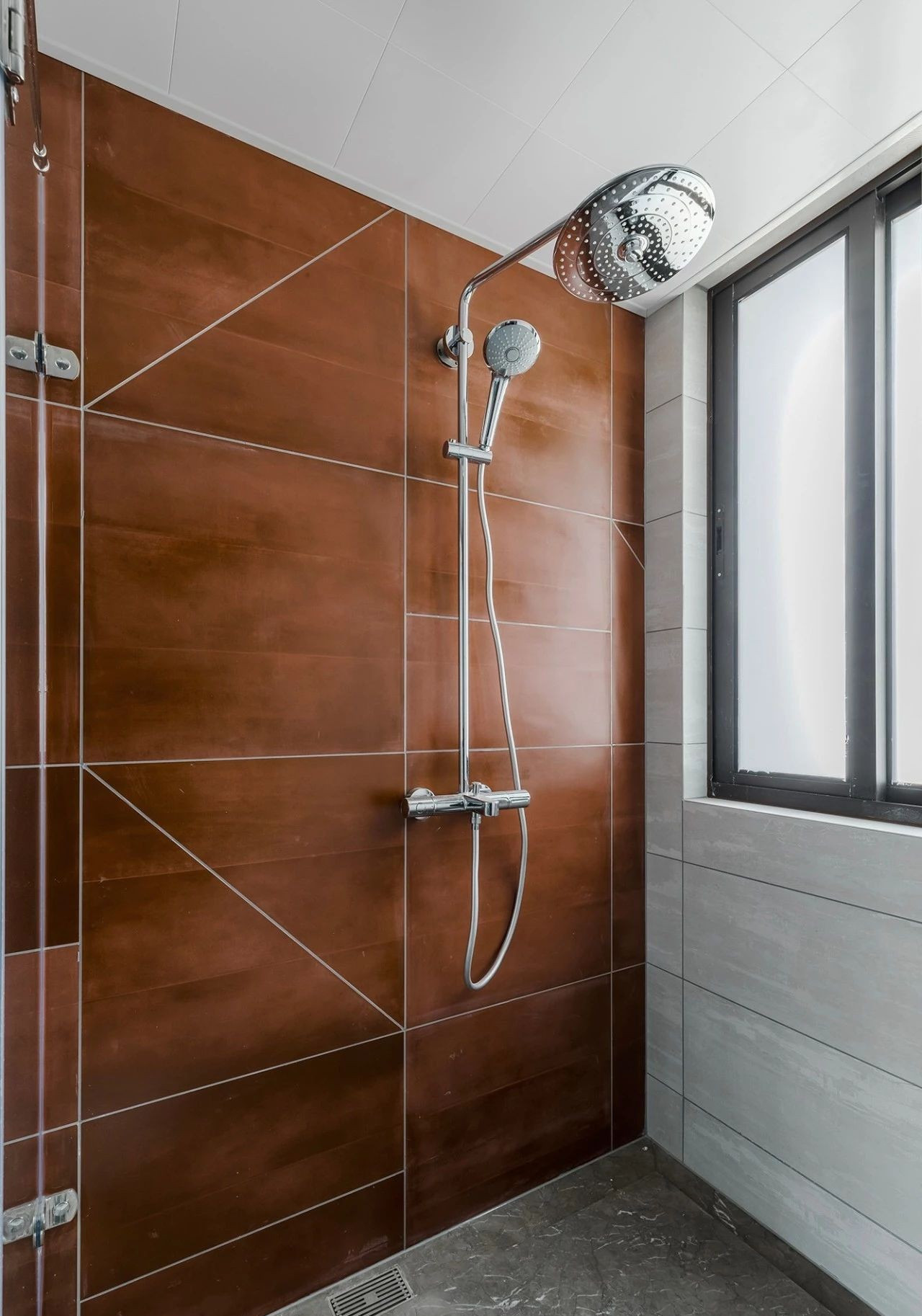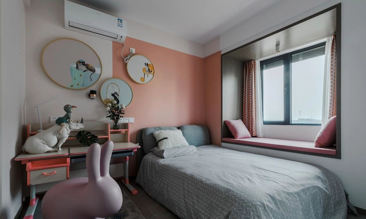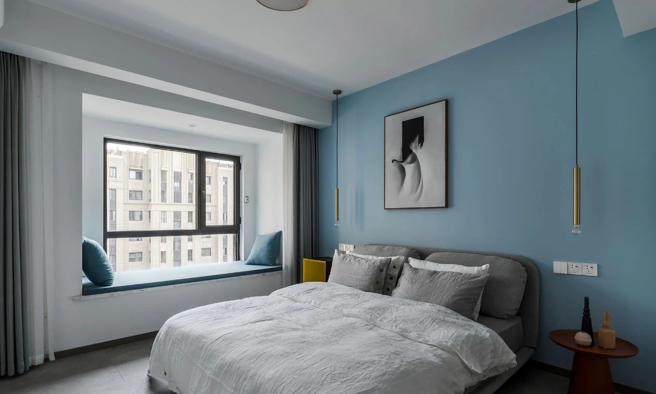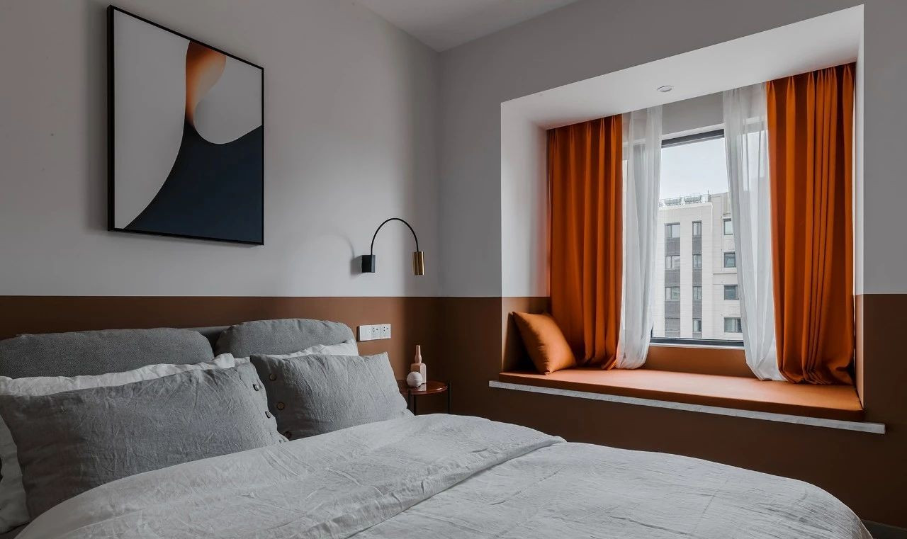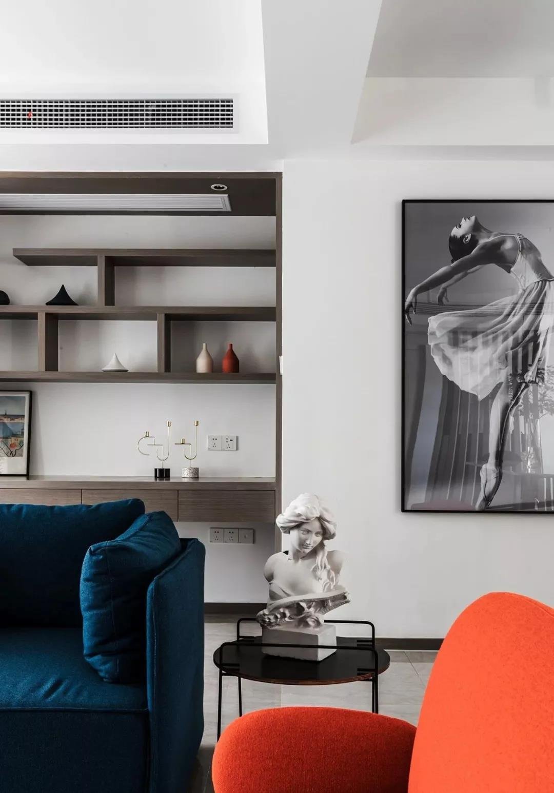 玄關采用斜面格柵結合玄關柜,過道將客餐廳在空間上進行簡潔的軟性分割,撞色的設計為客廳注入活力,整套房屋的設計就是兼具優雅和理性,活潑的同時又帶著一點克制,很適合年輕的業主。