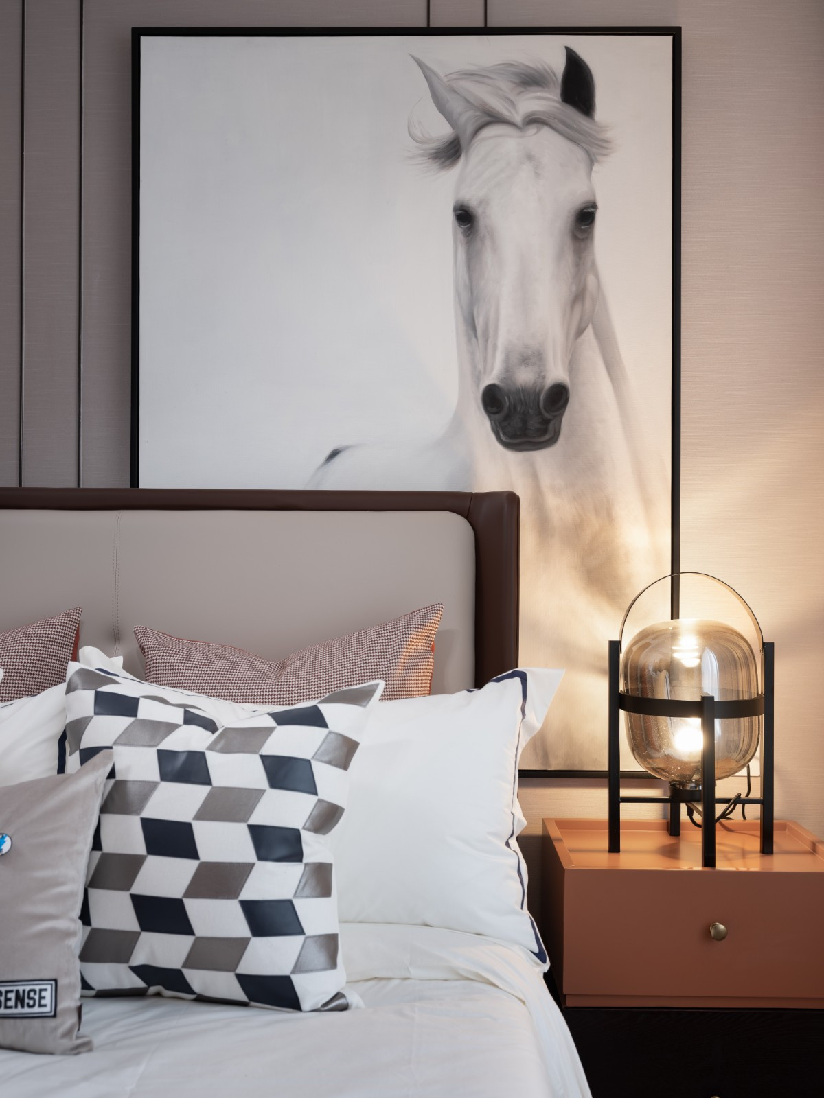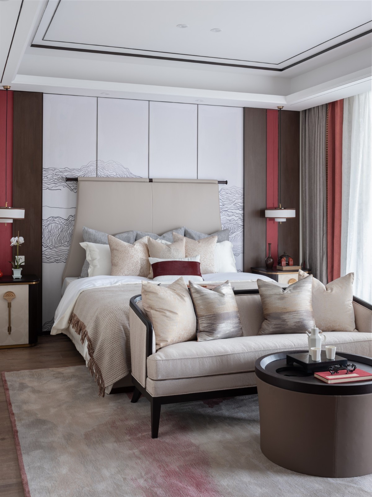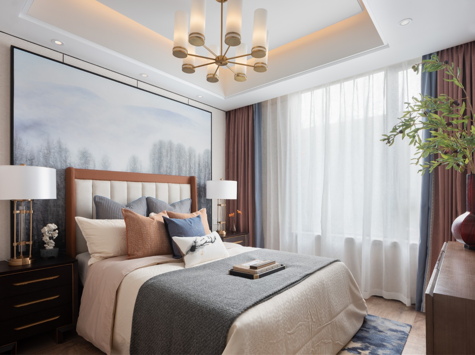 這是業主為父母準備的養老房,兒女時不時會過來住住。中式風是家裝主基調,但是為了更契合當代人的生活習慣,所以設計上也會偏向于現代風。臥室的背景墻是一副意境十足的水墨畫,能給人帶來一種寧靜、舒適的感覺。