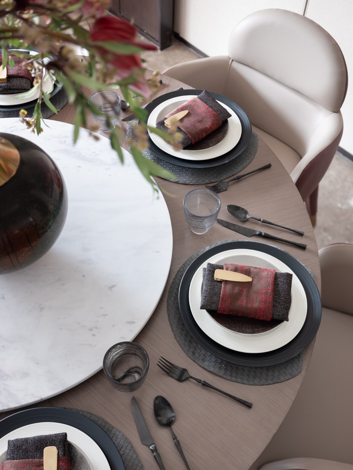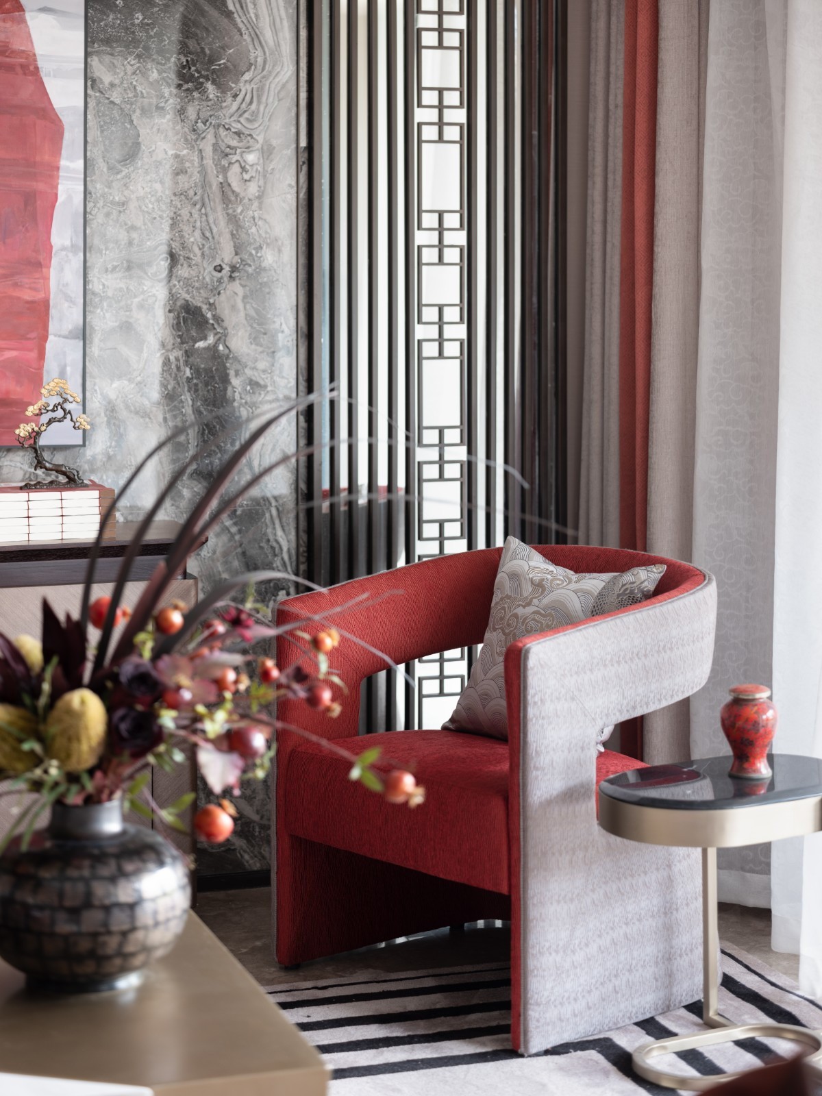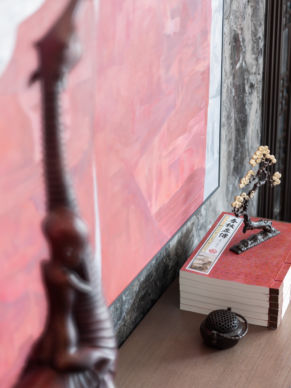 這是業主為父母準備的養老房,兒女時不時會過來住住。中式風是家裝主基調,但是為了更契合當代人的生活習慣,所以設計上也會偏向于現代風。臥室的背景墻是一副意境十足的水墨畫,能給人帶來一種寧靜、舒適的感覺。