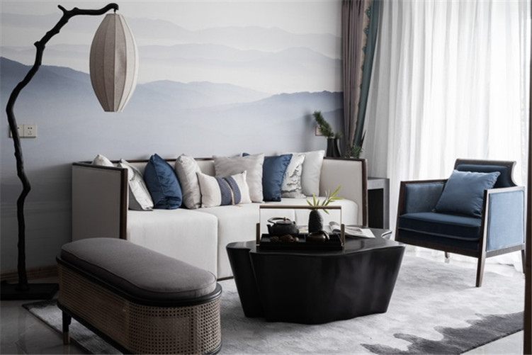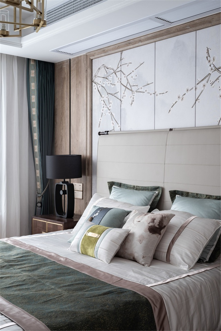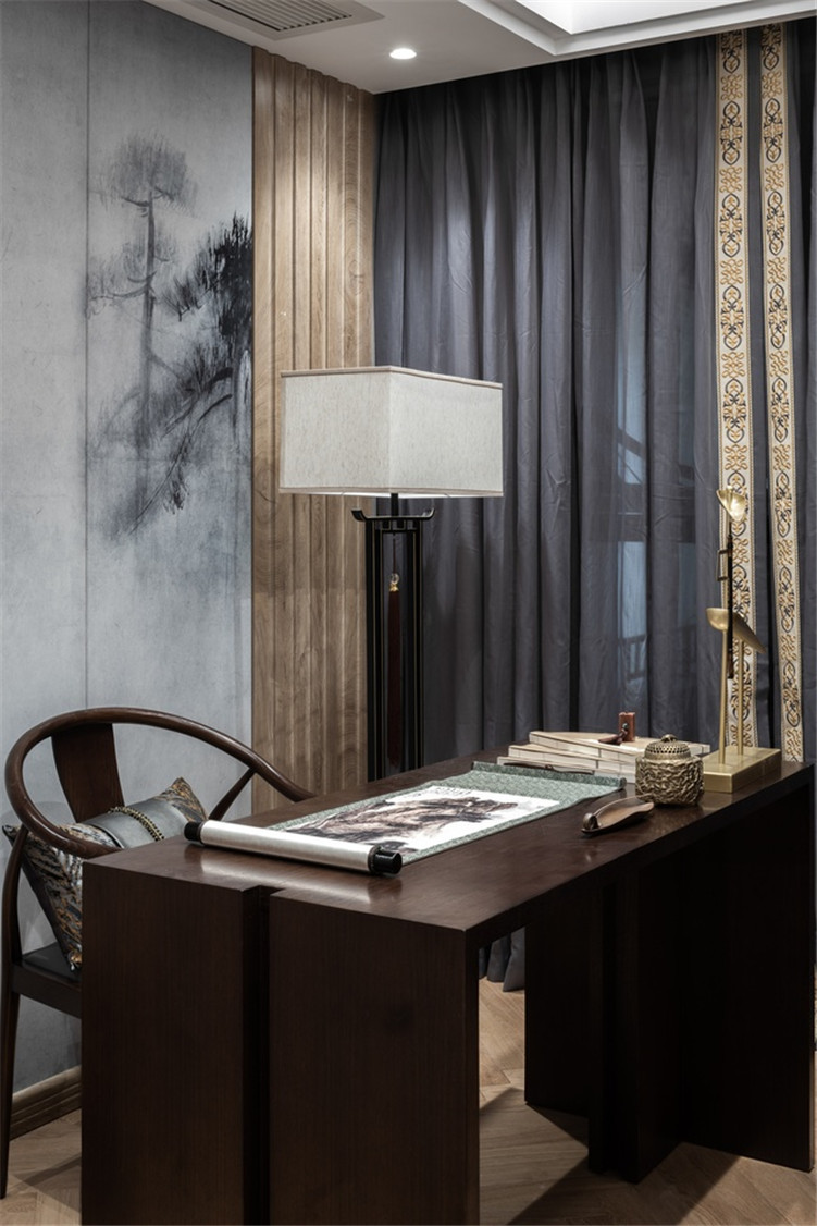 設(shè)計(jì)師在臥室背景墻、客廳背景墻和書房背景墻上,下了很多功夫。客廳的背景墻是一片遠(yuǎn)山,意境更深,有一種層次感。書房的背景墻則是柏樹,象征堅(jiān)強(qiáng)、高尚。而臥室的背景墻則是臘梅,凌寒獨(dú)自開,象征君子氣節(jié),業(yè)主很喜歡這些背景墻的立意。