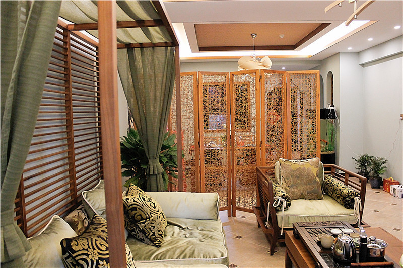 業(yè)主喜歡東南亞風(fēng)格的異域感與大氣感,客廳給人的第一印象就是豪華與穩(wěn)重,但是細(xì)看又處處精致。東南亞風(fēng)格崇尚保留材質(zhì)的本味,所以木質(zhì)的家具從來不會用太多的裝飾去掩蓋,自然而然地流出一種優(yōu)雅感。