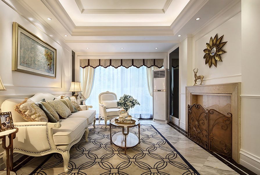 這套歐式風格在硬裝上保留歐式神態,軟裝上則放棄了歐式家具的雍容華貴,用淡藍色布藝配合白色家具輪廓,更符合當代人的生活習慣與品位。設計師在材料選擇上多用的用純色系,家具的線條十分簡潔,能夠進一步提升空間感。