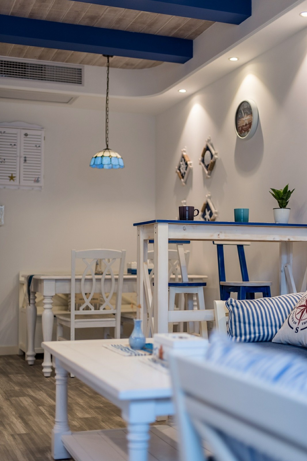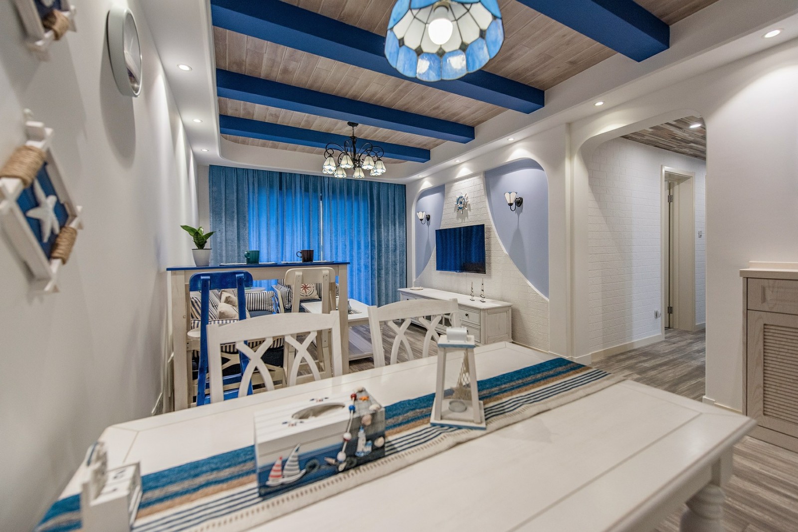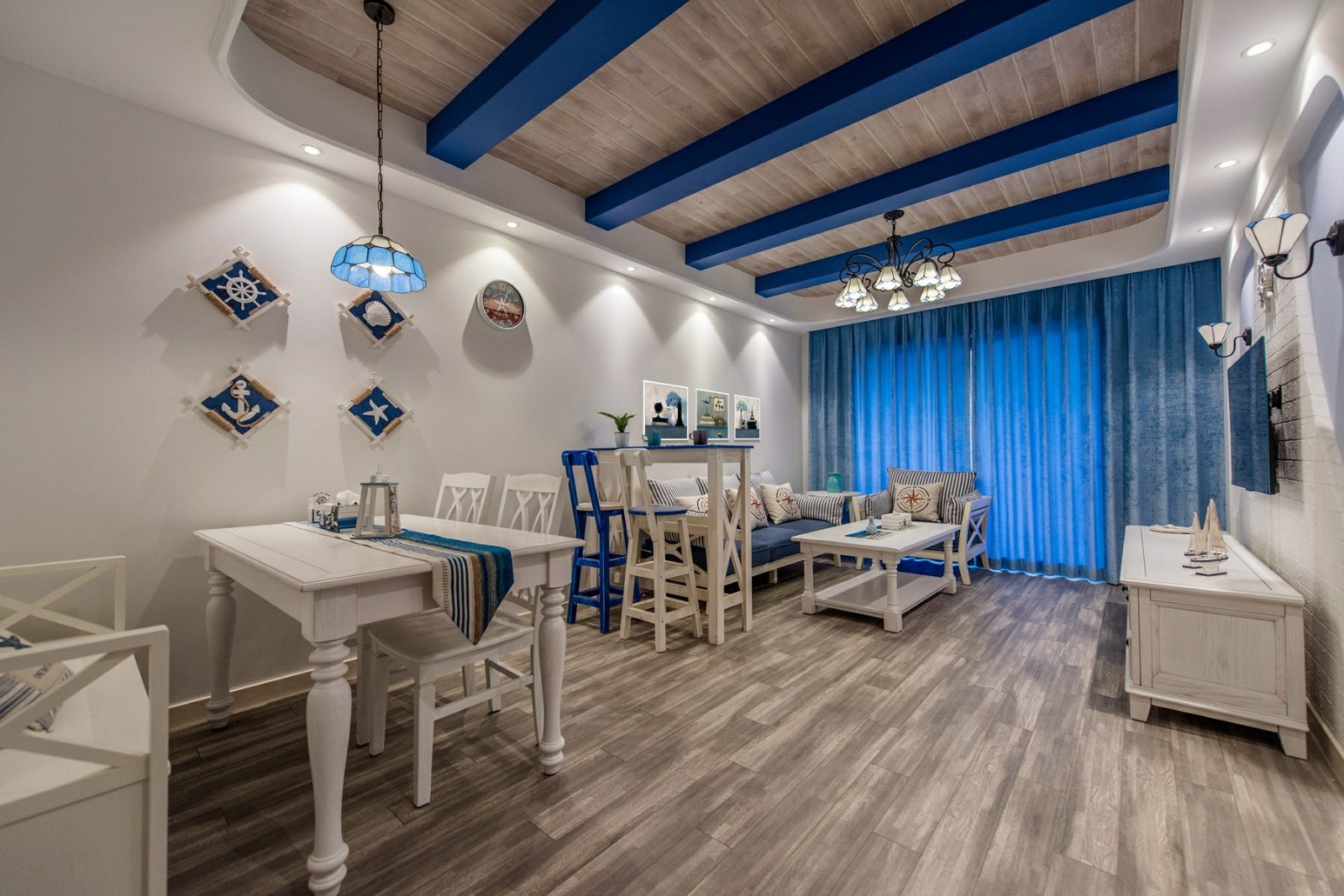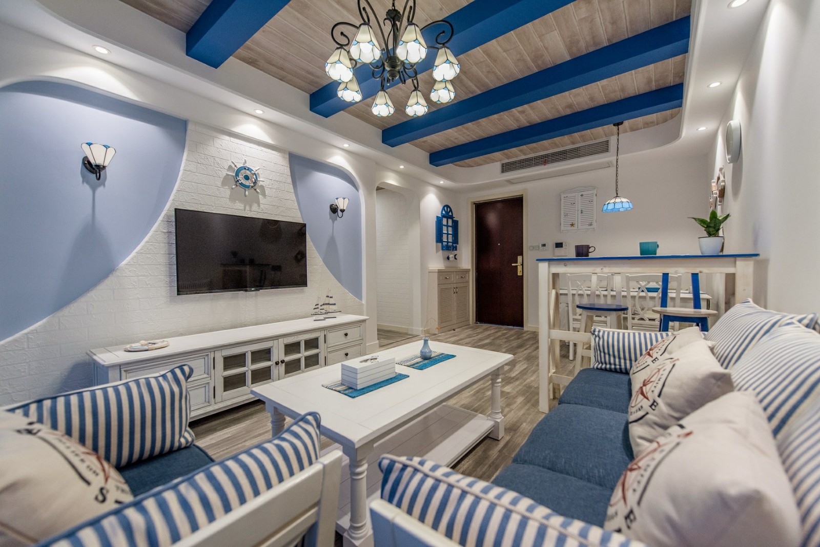 這一套地中海風格的色調比較冷靜,每一處裝飾都恰到好處。精心選擇的氛圍燈,打造了一種浪漫的意境,整體是清爽的海洋風,很是舒適大氣。天花板的造型很是別致,木紋飾的吊頂搭配上藍色的橫條,簡潔又具備著極強的設計感。