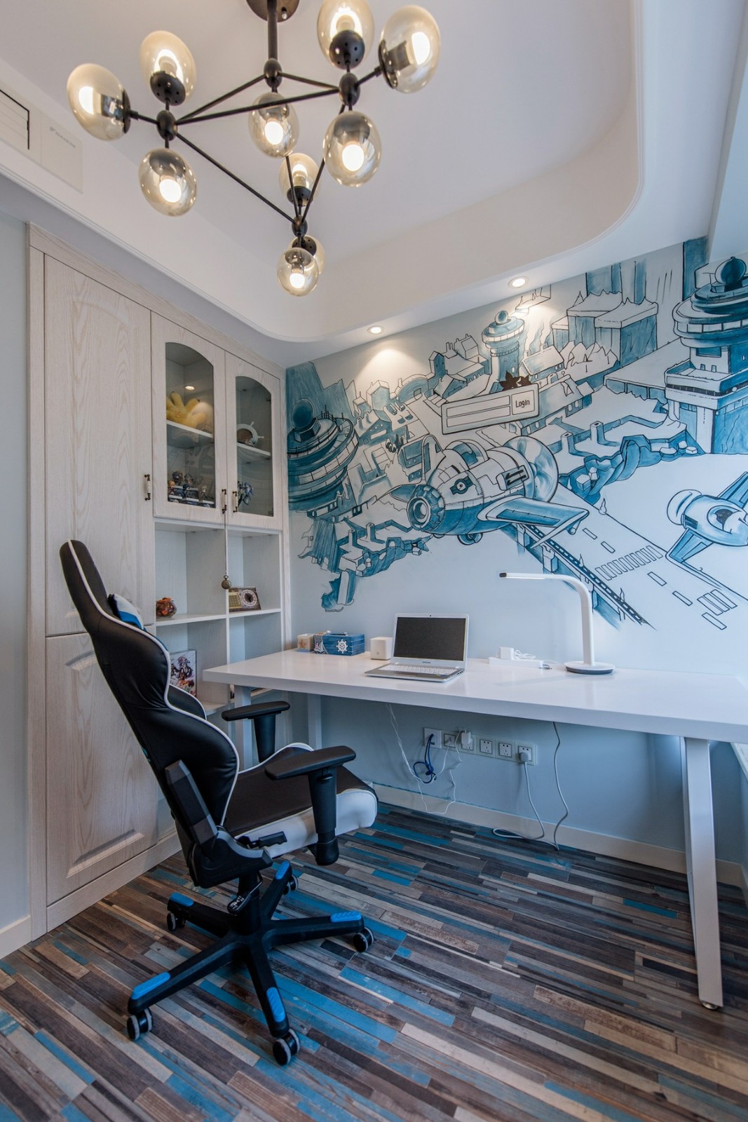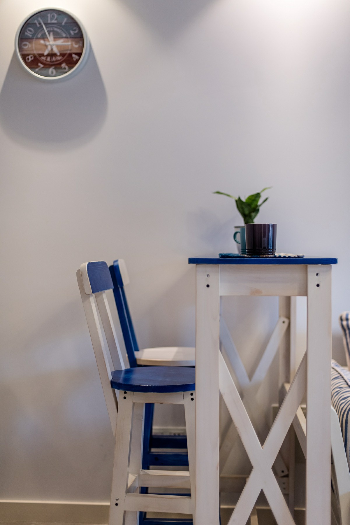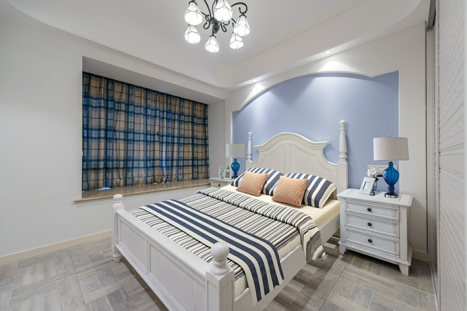 這一套地中海風格的色調比較冷靜,每一處裝飾都恰到好處。精心選擇的氛圍燈,打造了一種浪漫的意境,整體是清爽的海洋風,很是舒適大氣。天花板的造型很是別致,木紋飾的吊頂搭配上藍色的橫條,簡潔又具備著極強的設計感。