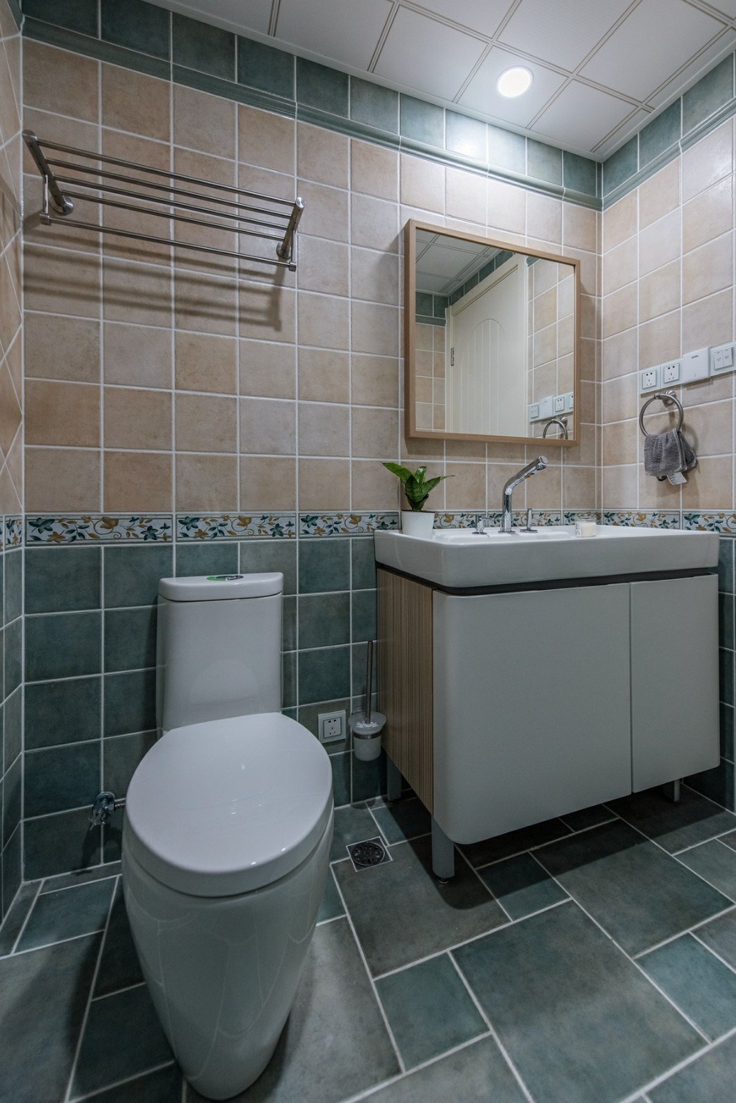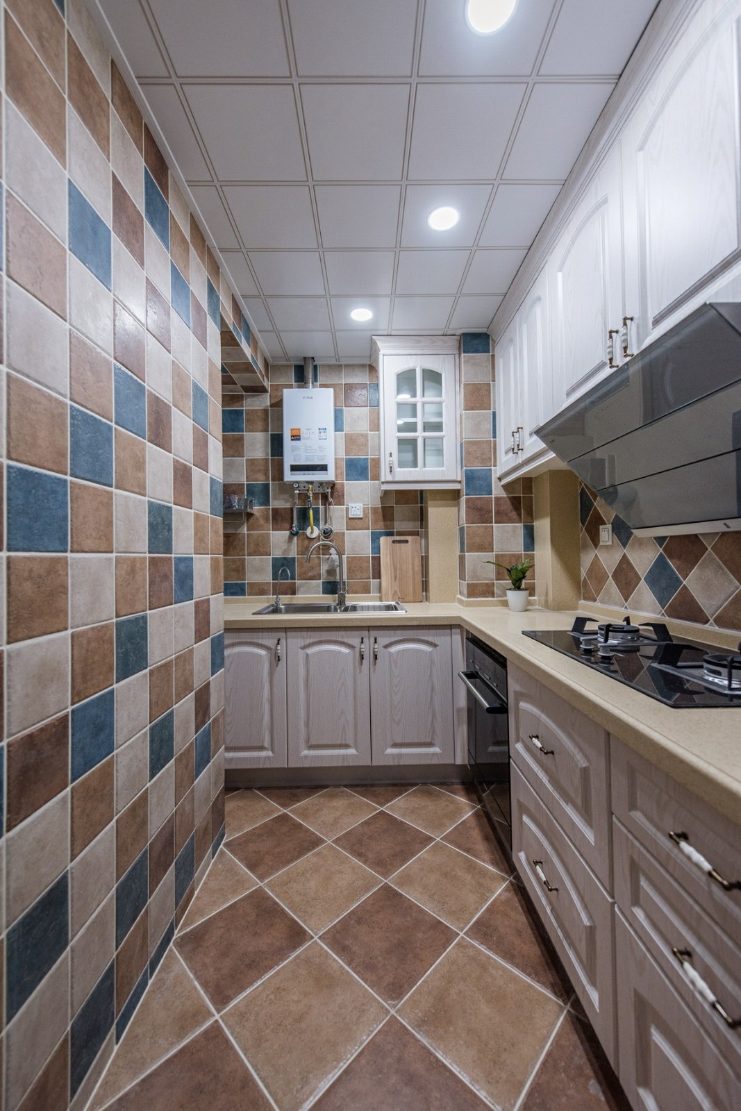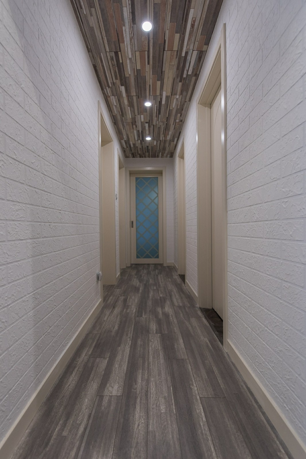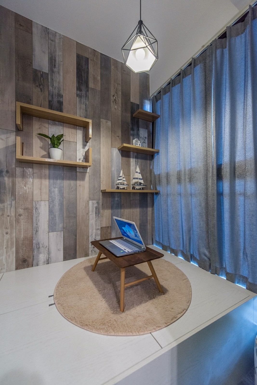 這一套地中海風格的色調比較冷靜,每一處裝飾都恰到好處。精心選擇的氛圍燈,打造了一種浪漫的意境,整體是清爽的海洋風,很是舒適大氣。天花板的造型很是別致,木紋飾的吊頂搭配上藍色的橫條,簡潔又具備著極強的設計感。