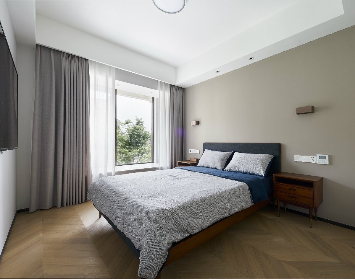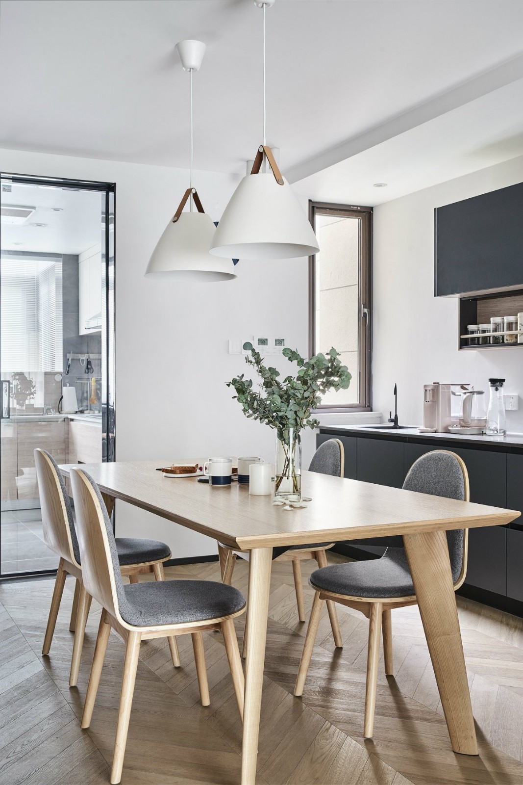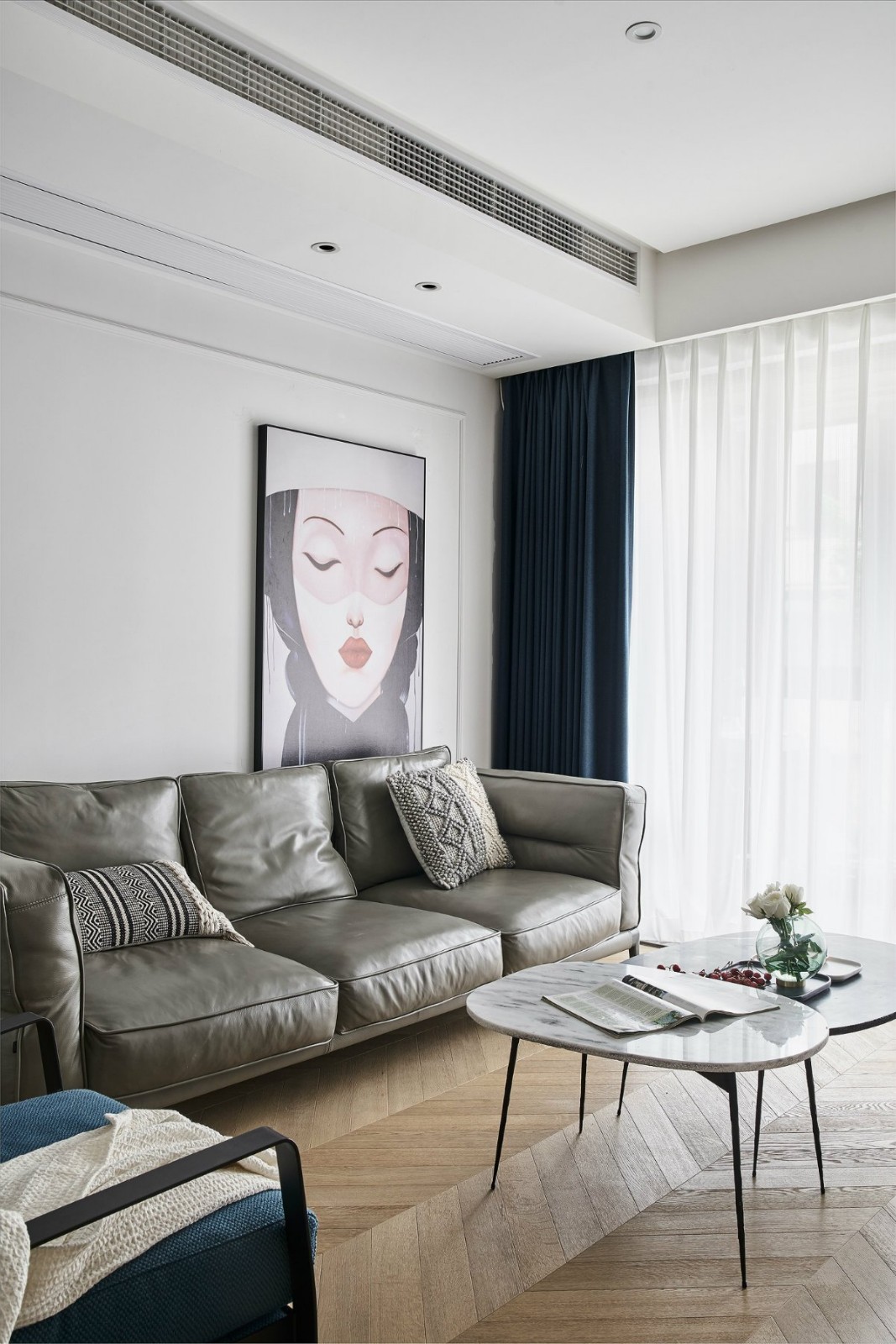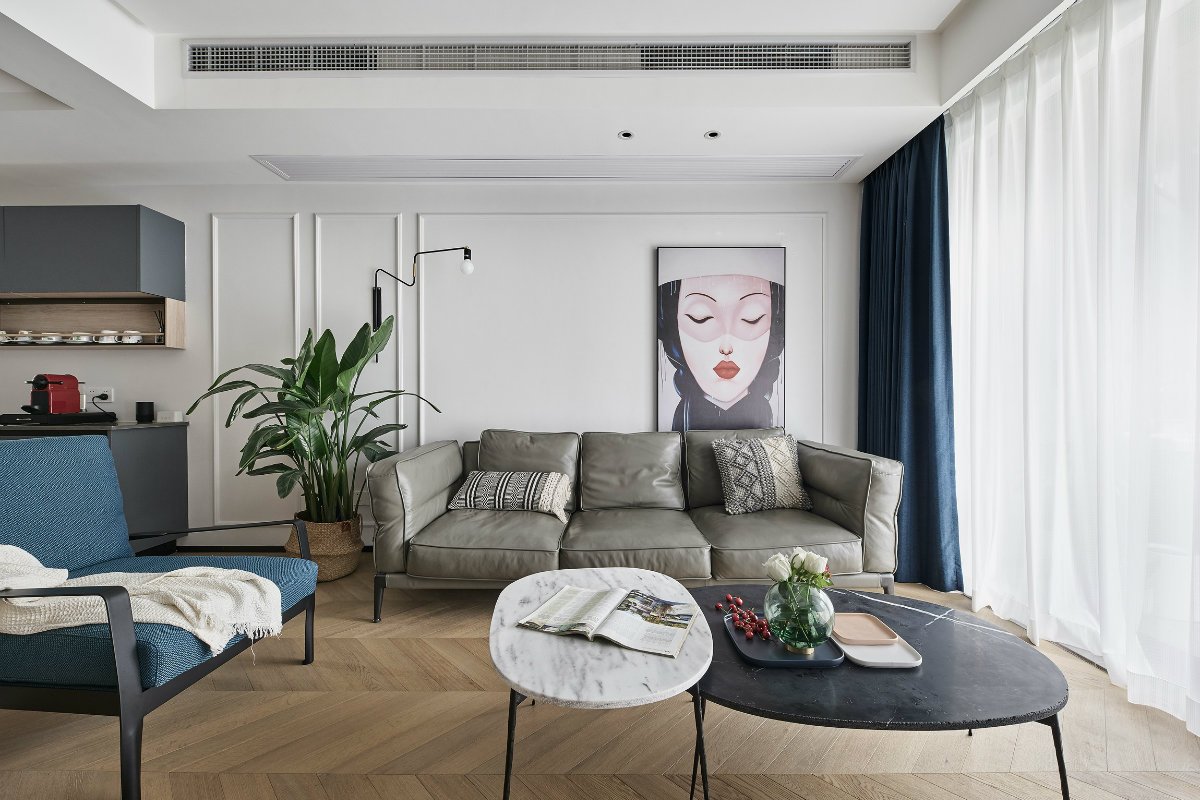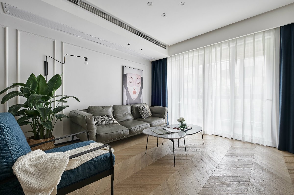 業主喜歡簡單時尚的設計,設計師在所以滿足功能性的同時,結合原木打造出清新愜意的舒適空間。沙發背景只用了簡單的石膏線條,對應純白的電視背景,再搭配裝飾畫和旁邊的綠植,無形之中為客廳增添了不少活力。
